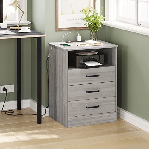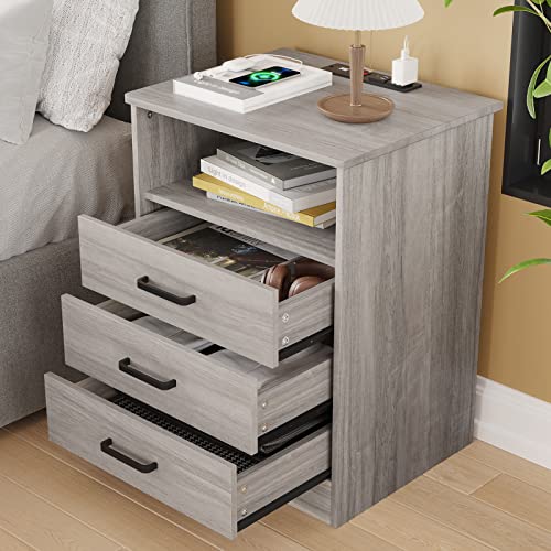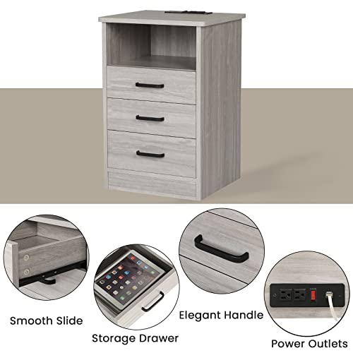 ADORNEVE Nightstands Set of 2, Grey Night Stands with Charging Station, Bedside Table with Drawers & USB Ports for Bedroom,Living Room