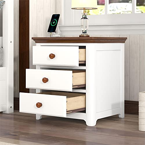White Nightstand Set of 2 with Charging Station, Modern Night Stands with USB Ports and Outlets, End Table Bedroom with 3 Drawers, Wooden Storage Bedside Tables for Bedroom, Living Room