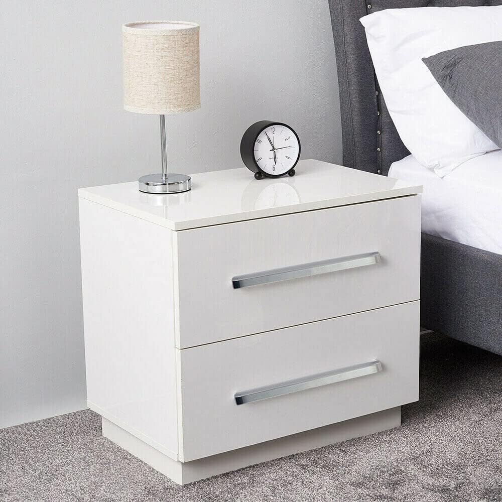 2 Drawers White Nightstand, High Gloss Nightstand LED Light Bedside Cabinet End Table Furniture for Bedroom Home Decor