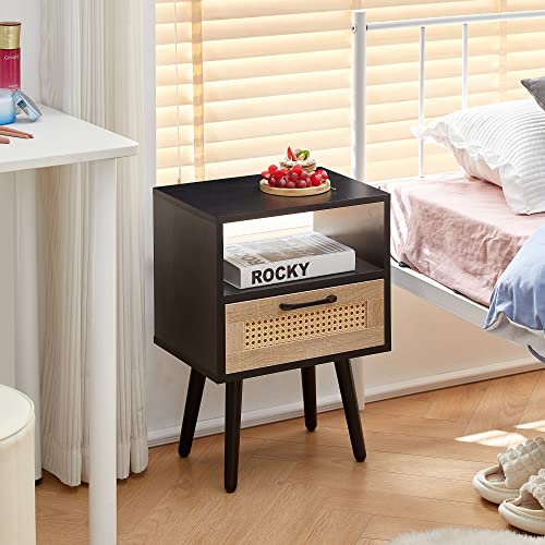 Meihua Rattan Nightstand with Charging Station, Boho Side Table with Handmade Rattan Decorated Drawer, Modern End Table for Bedroom, Living Room.