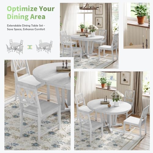 Rustic 5-Piece Extendable Dining Table Set, Round Trestle Table & 4 Cross Back Dining Chairs, Solid Wood, for Kitchen & Dining Room, Adjustable Table Length, Natural Finish (Natural)