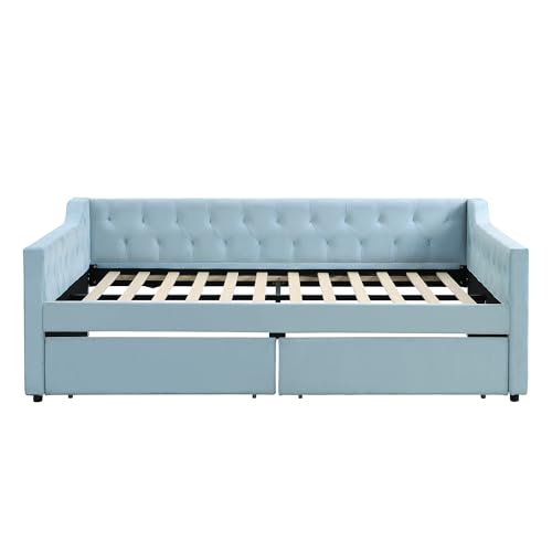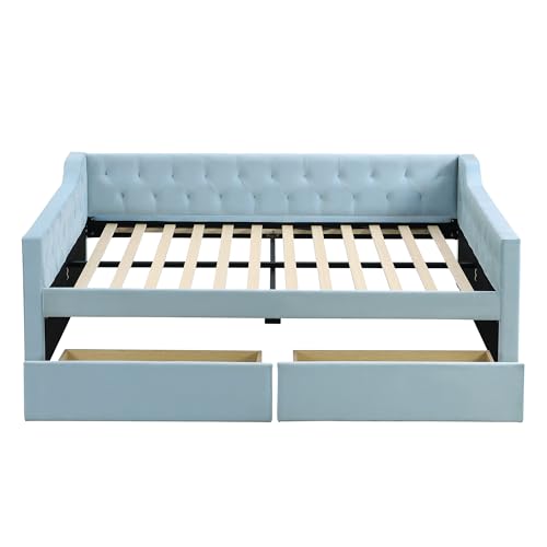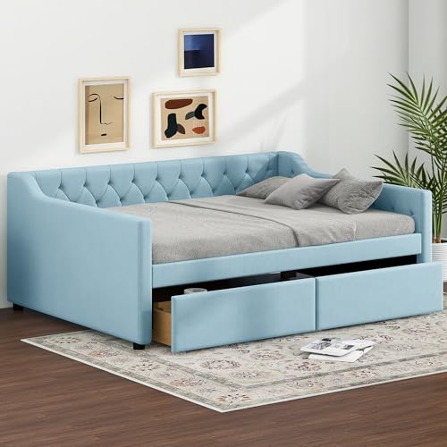 Full Size Upholstered Tufted Daybed, Velvet Sofa-Bed with Button Tufted Back and Nailhead Decorated Waved Shape Arm, Solid Wood Frame, Bedframe for Bedroom Livingroom Small Space (Beige&Drawers)