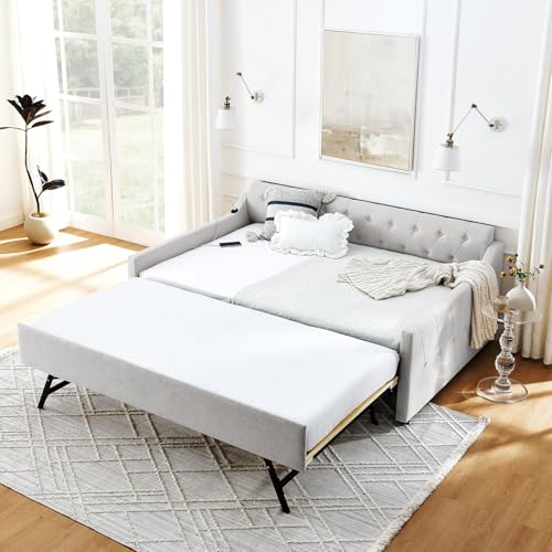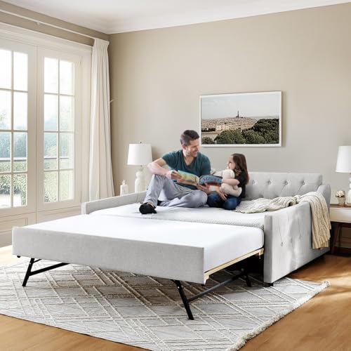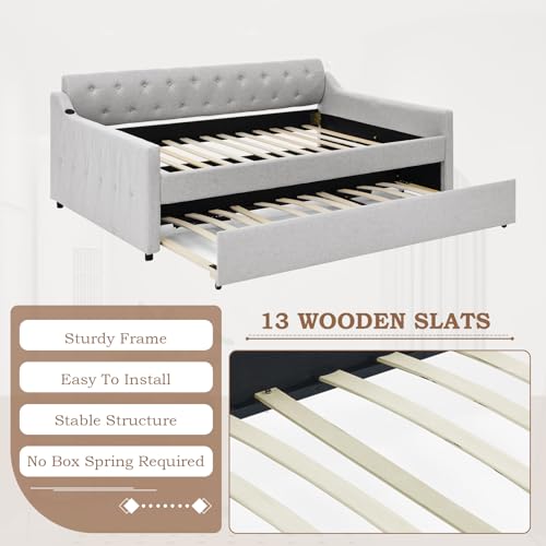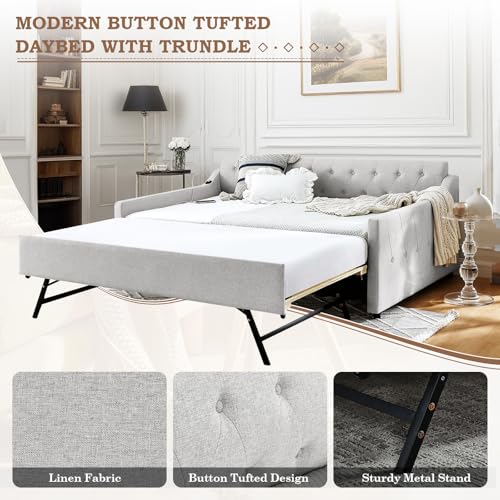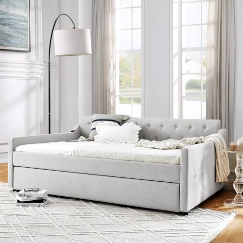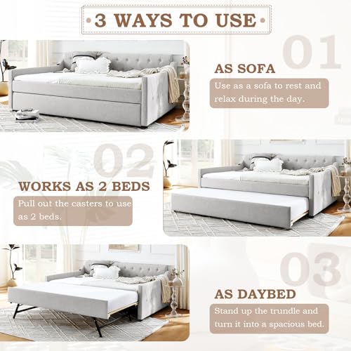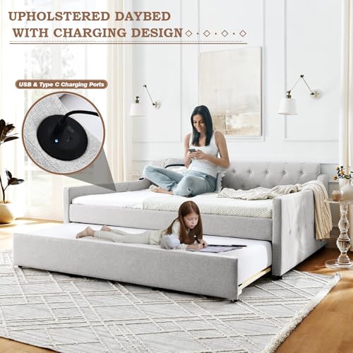 Full Day Bed with Pop Up Trundle,Linen Button Tufted Extending Sofa Couch Bed w/USB&Type C Port,Upholstered Wood Daybed Frame for Living Room,Bedroom,Guest Room,No Box Spring Needed(Beige)