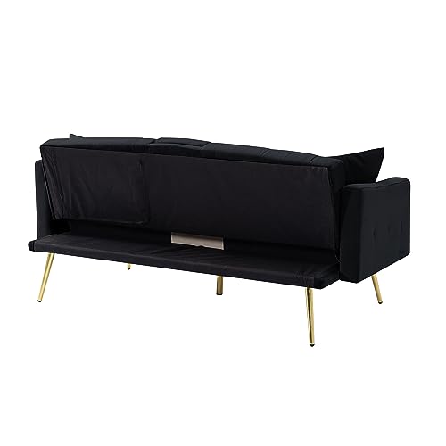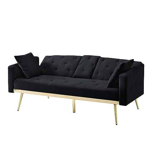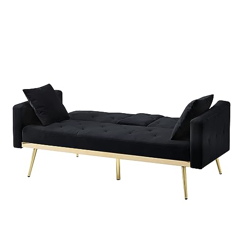 Velvet Tufted Folding Sleeper Sofa Couch Bed Convertible Futon Loveseat Reversible Lounge Chaise Daybed with Adjustable Backres,Golden Metal Legs,Throw Pillows for RV Apartment Small Places