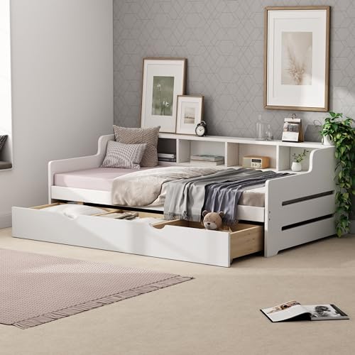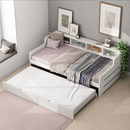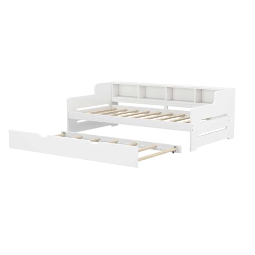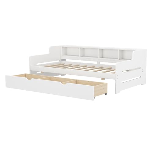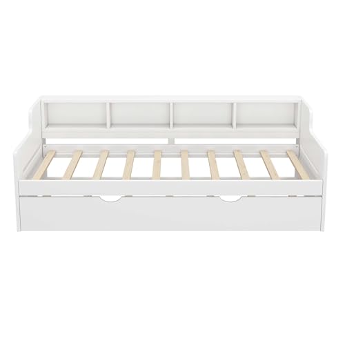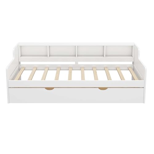 WasaFire Twin Size Wooden Day Bed with Trundle for Guest Room Small Bedroom Study Room (white)