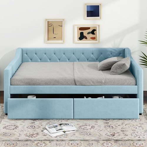 Twin Daybed with Trundle Bed Frame, Sofa Bed Frame, Modern Upholstered Day Bed Twin Size with Wood Slat Support for Small Spaces Guest Living Room Dorm, Bedroom Furniture (Green)