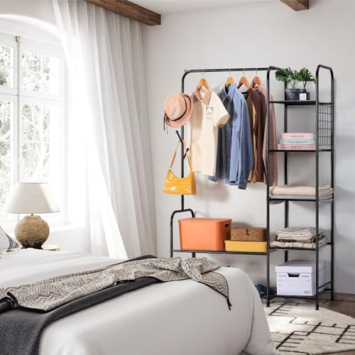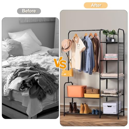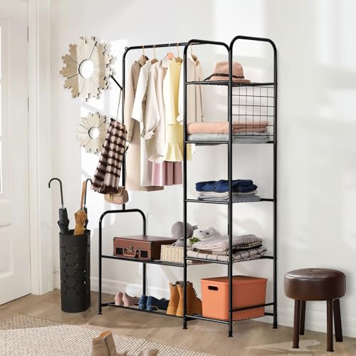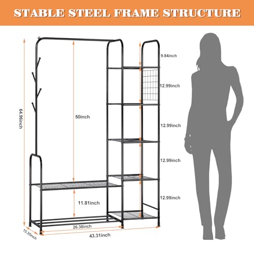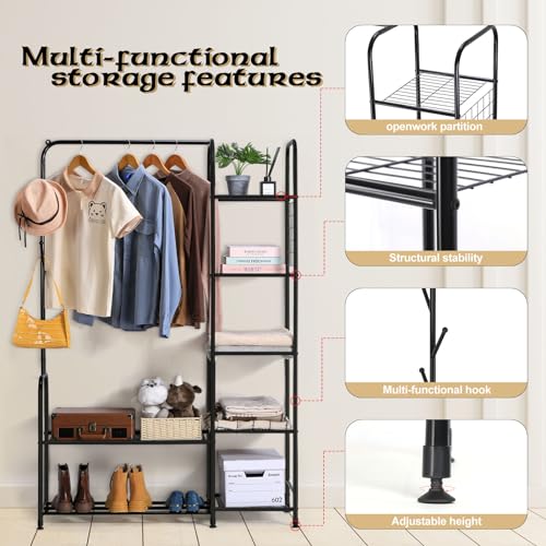 melos Clothes Rack, Coat Rack Metal Garment Rack With Storage Shelves and Coat/Hat Hanging Hooks, Portable Closet System Organizer, Freestanding Clothes Rack For Bedroom, Pace Saving