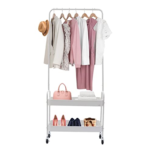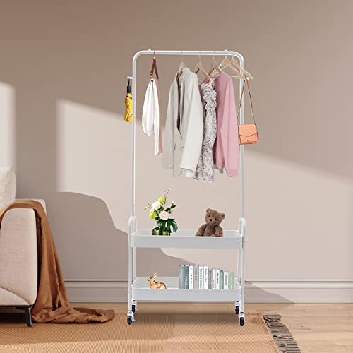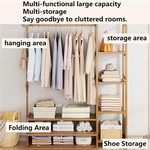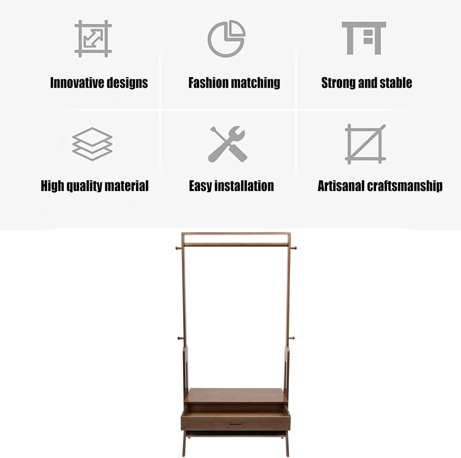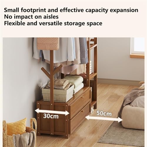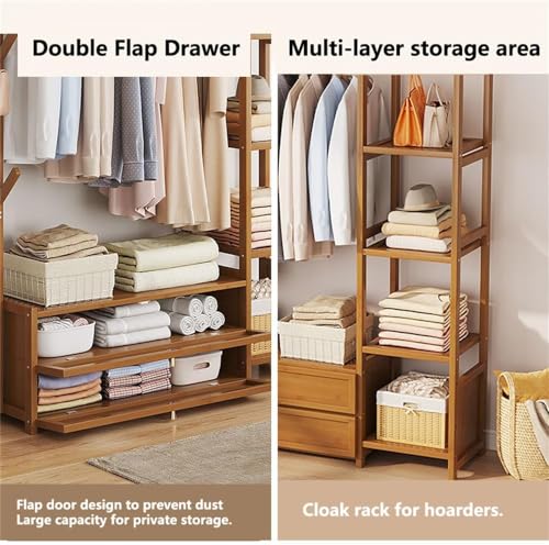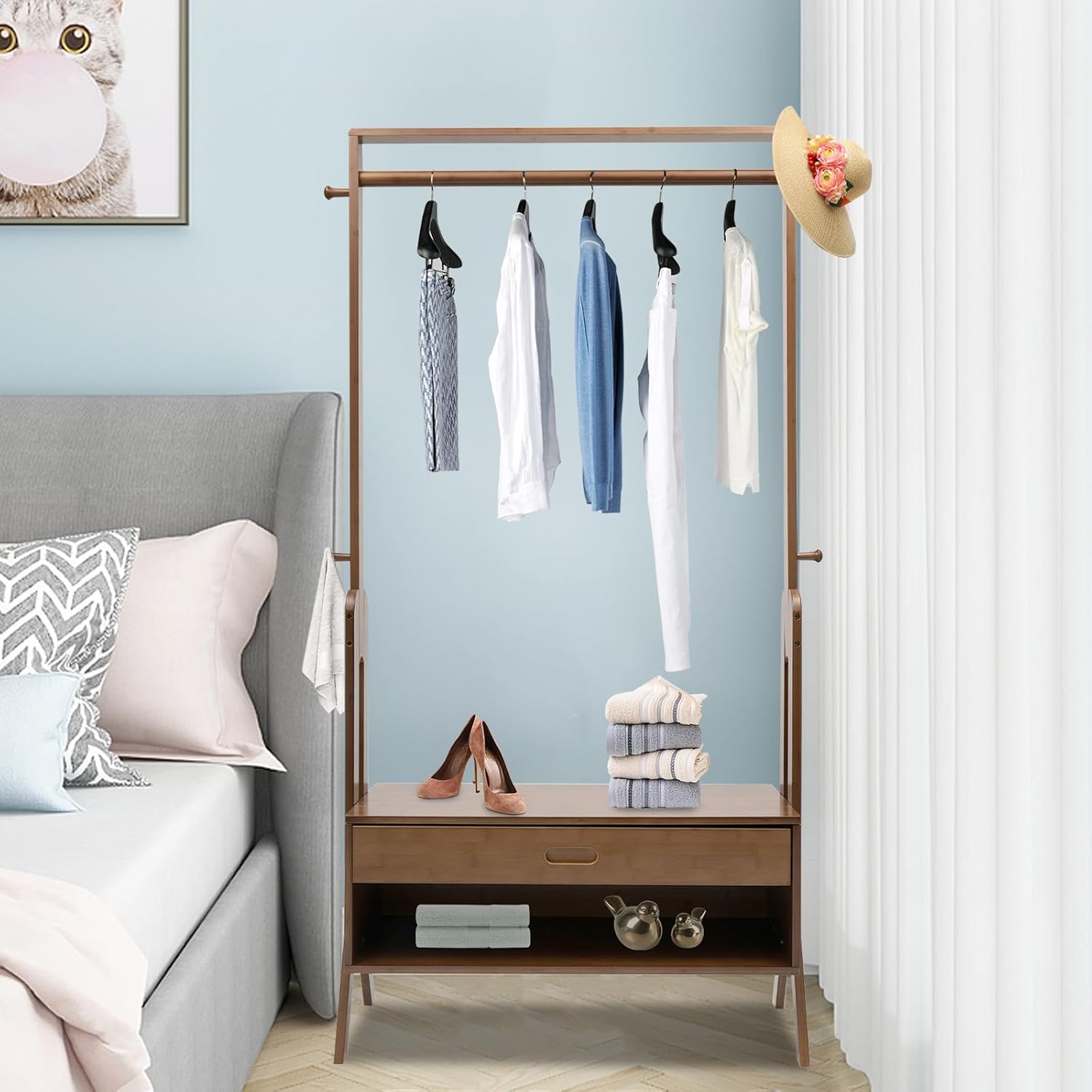 Garment Rack, Bamboo Storage Closet Organizer Coat Rack with Storage Drawer and Coat/Hat Hanging Hooks, Freestanding Wardrobe Closet Rack Clothing Rack for Hanging Clothes, Load Bearing 300lbs