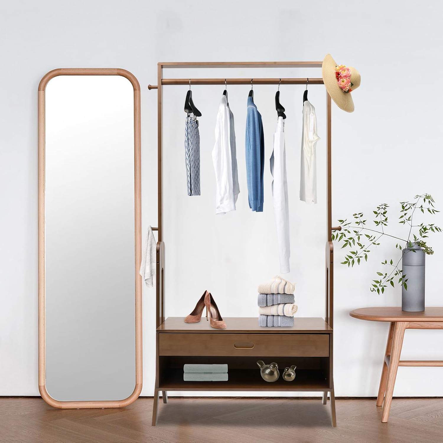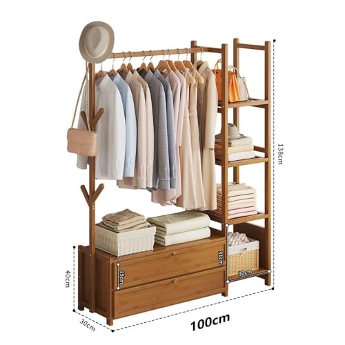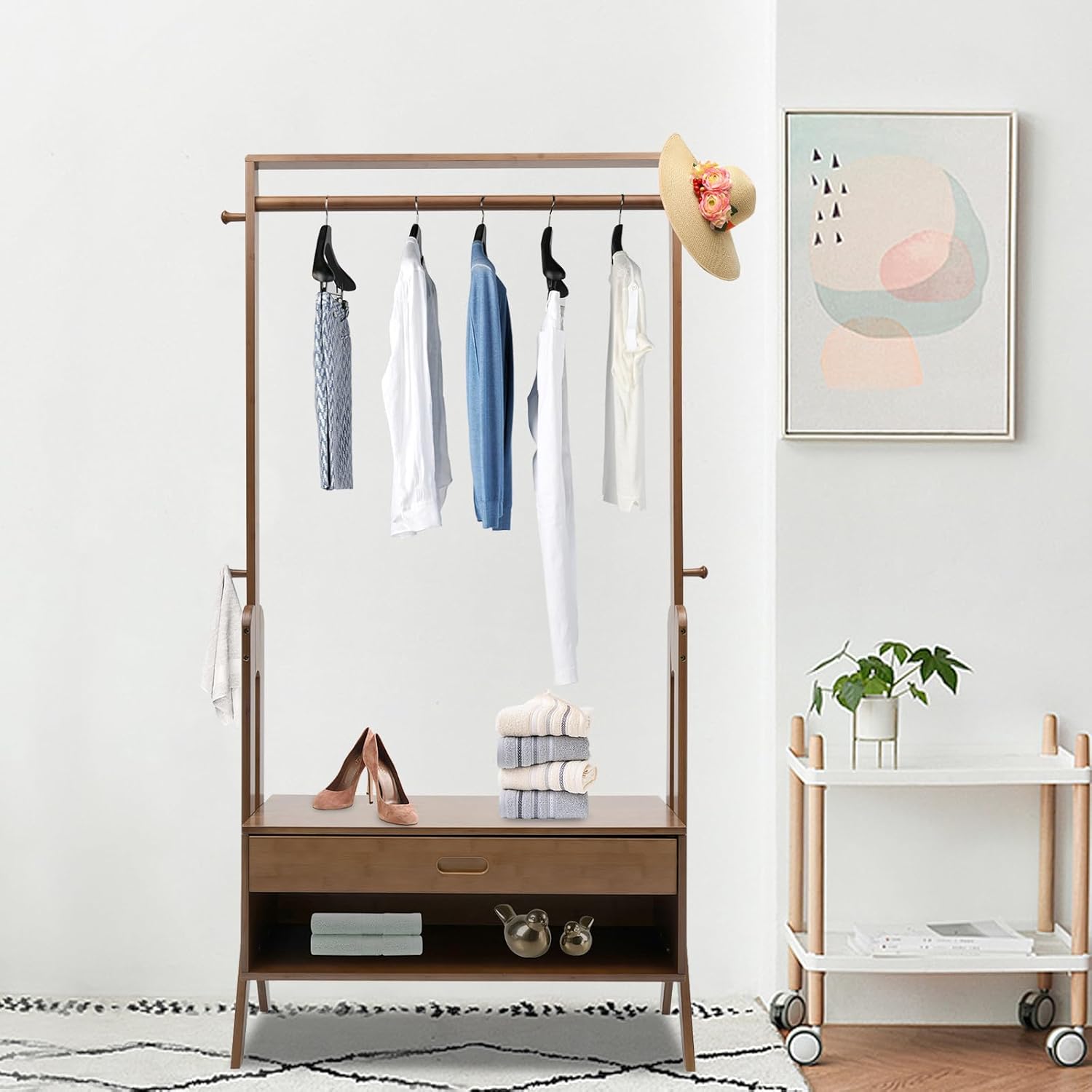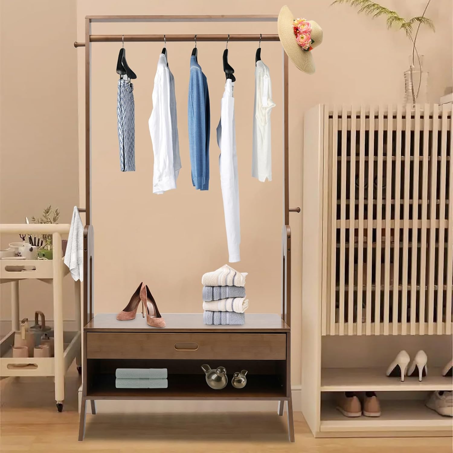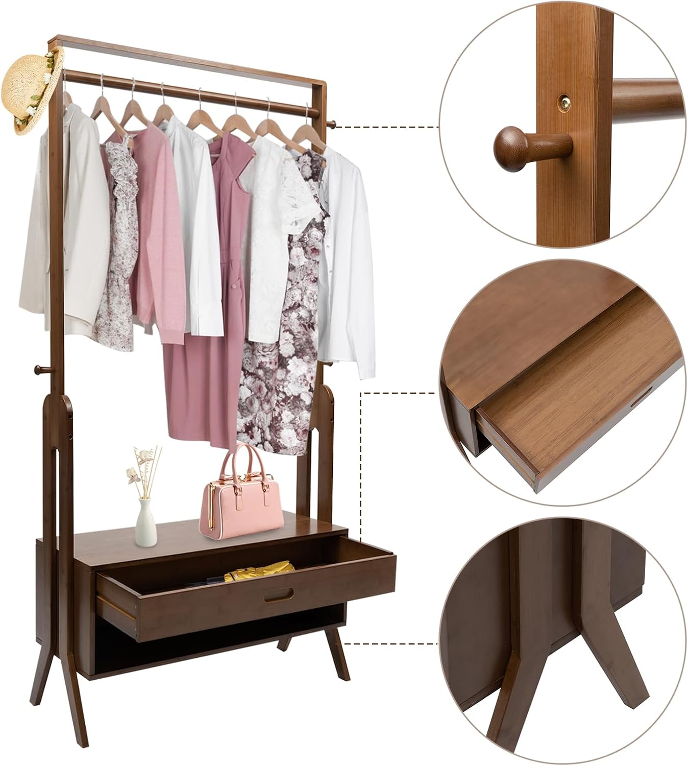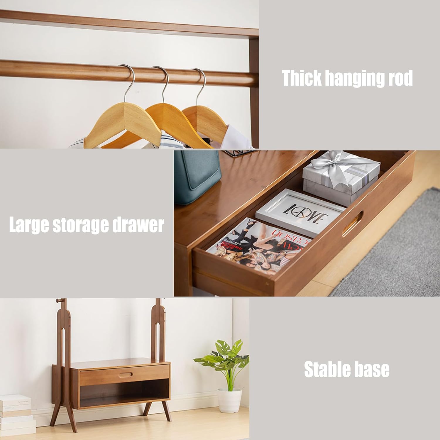 Bamboo Wooden Garment Rack, Freestanding Closet Organizers with Storage Drawer, Clothes Coat Rack for Hanging, Open Wardrobe for Entryway Bedroom Hallway Small Space
