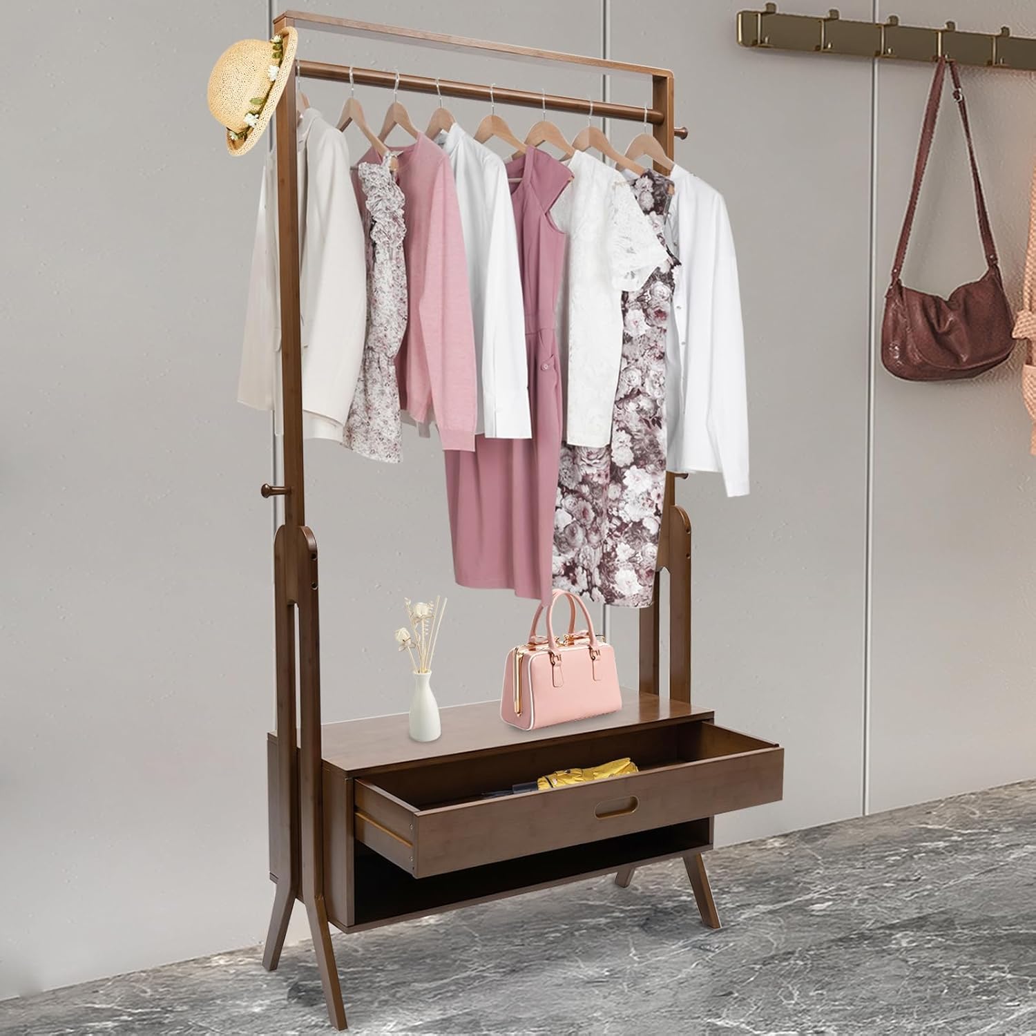 Vintage Bamboo Garment Rack, Freestanding Closet Organizer Coat Rack with Drawer & Hanger Hook, Multifunctional Bedroom Hanging Rack, Clothing Organizer Hat Tree for Bedroom, Hallways, Living Rooms