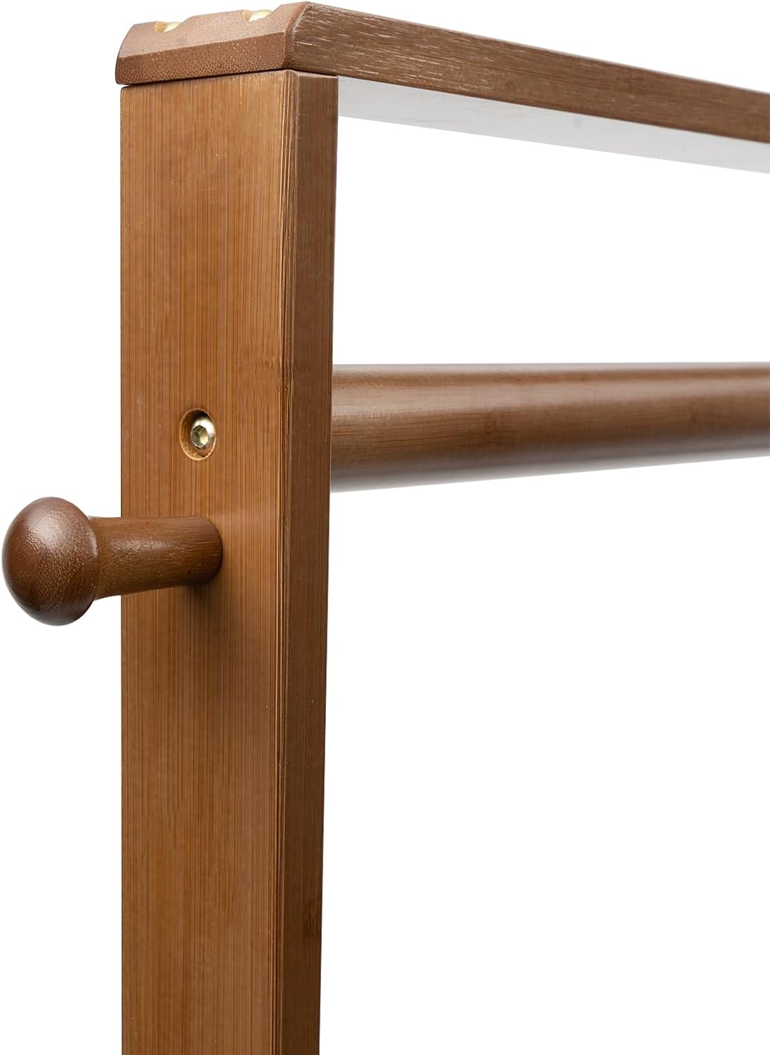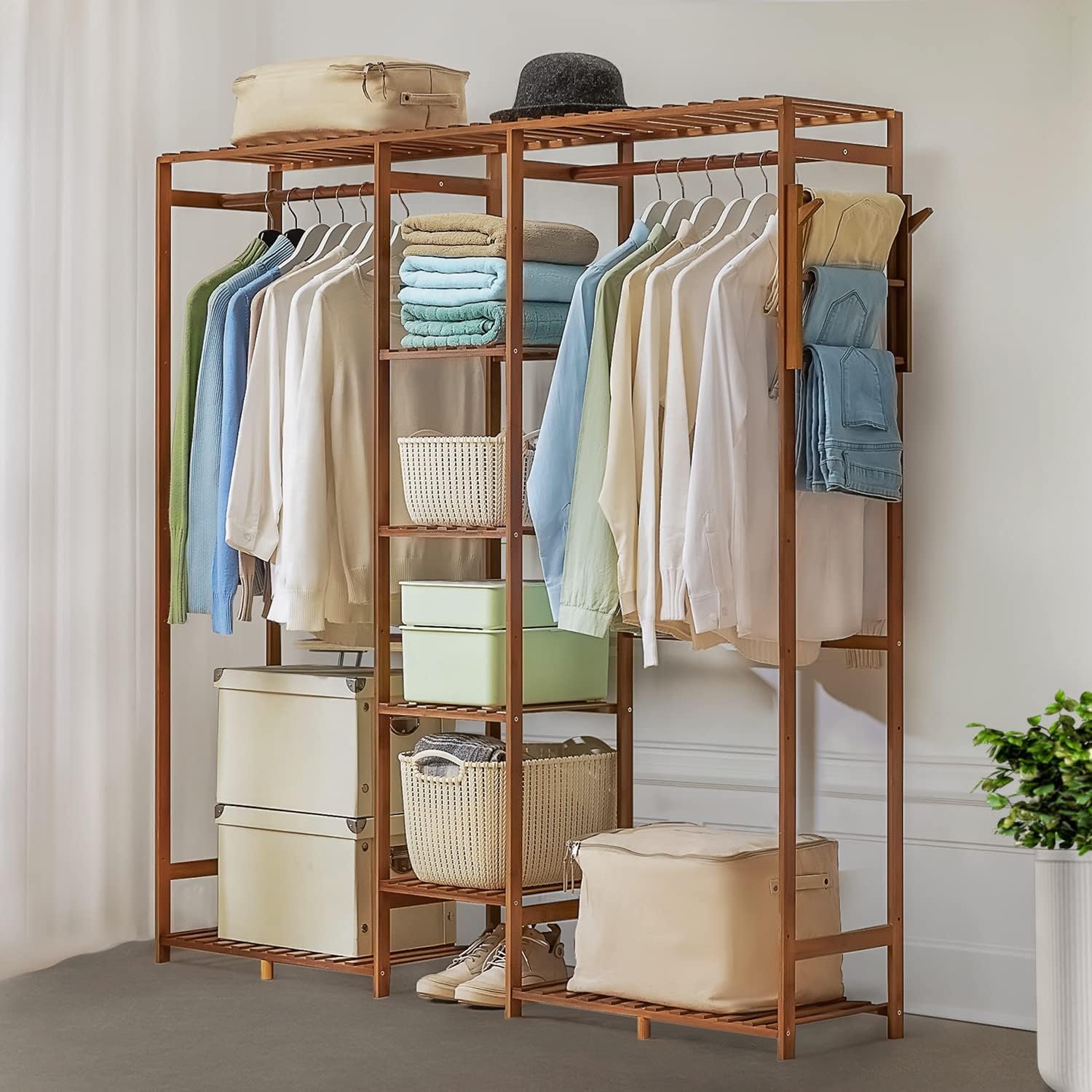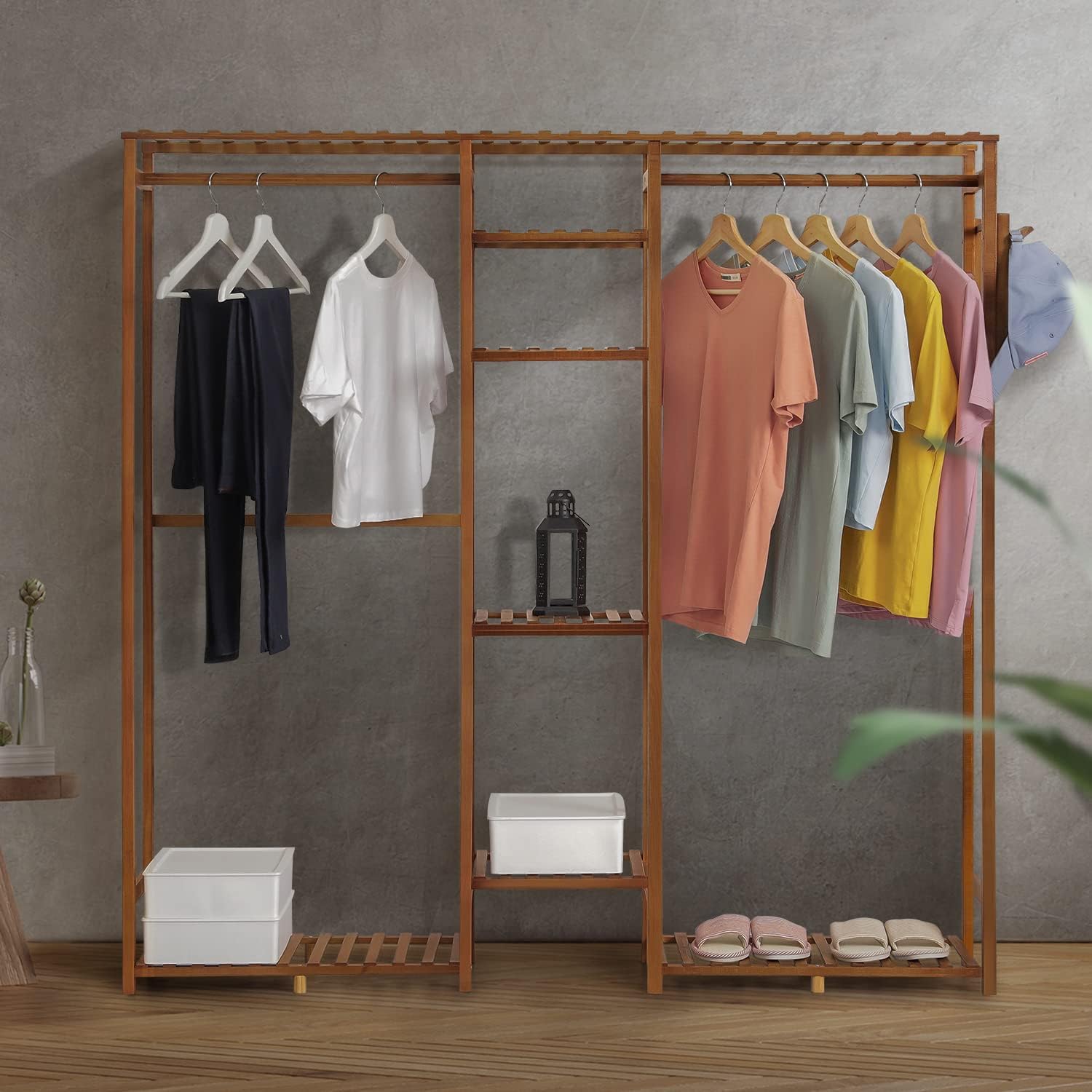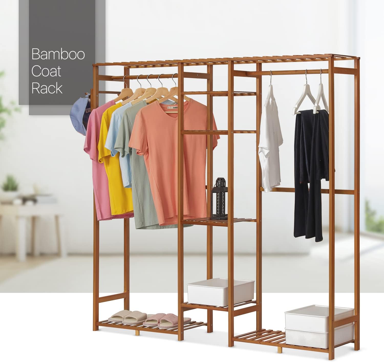 MoNiBloom 6-Tier Bamboo Garment Rack with Shelves Closet Coat Storage Organizer Clothes Dual Hanging Rack with Pants Rack & Hooks for Bedroom, Guest Room, Office, Mudroom, Brown