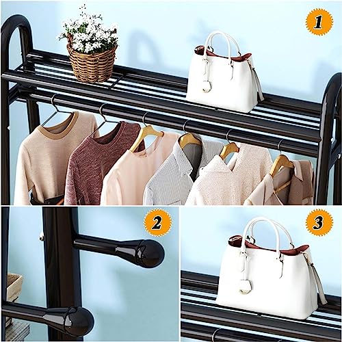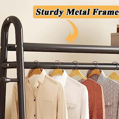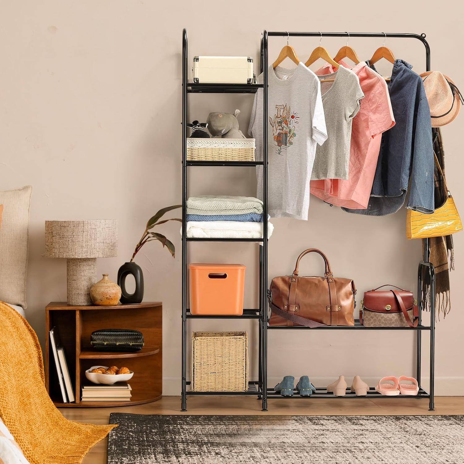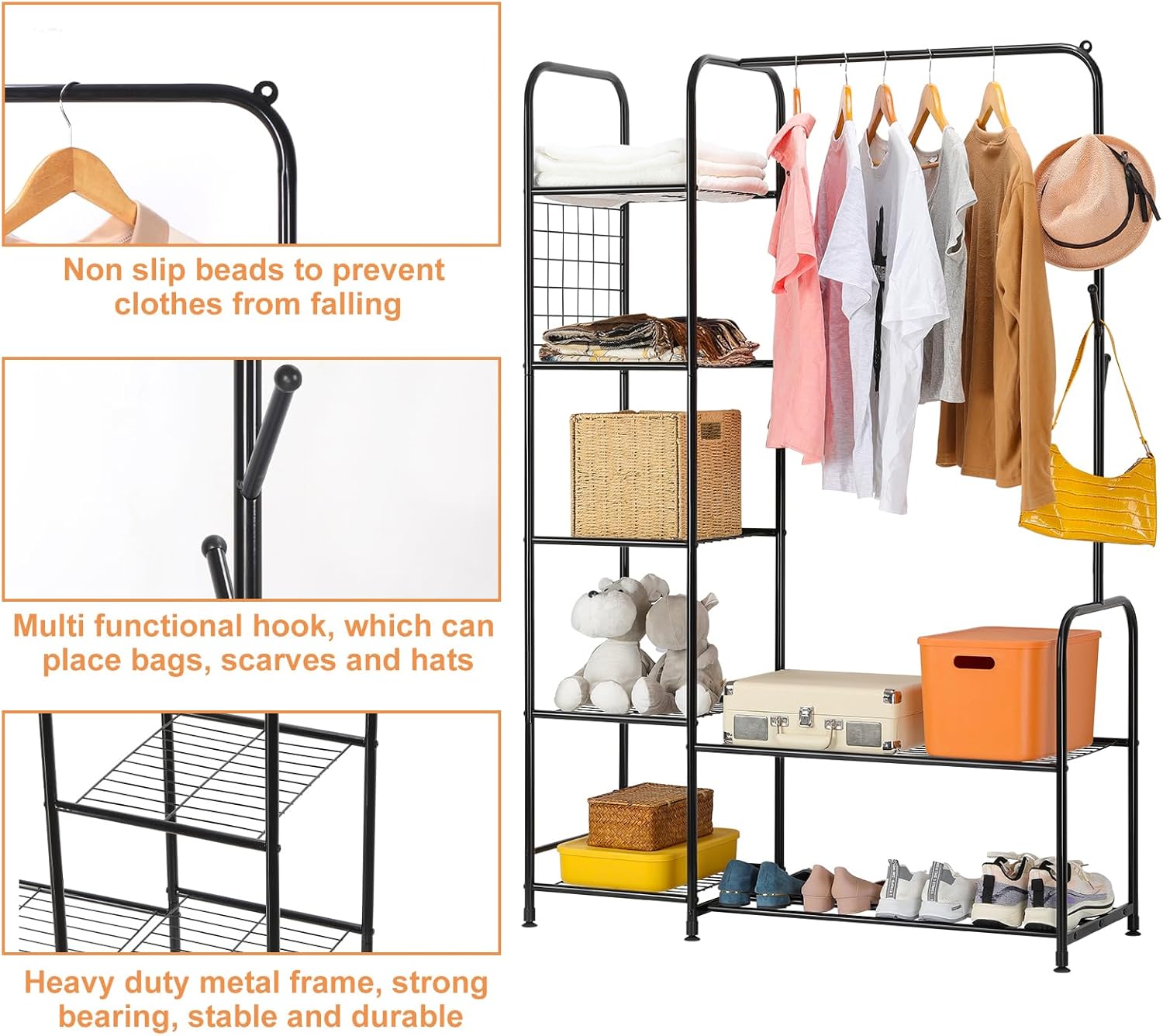 HEOMU Garment Rack with Shelves, Freestanding Clothes Rack, Portable Clothing Racks for Hanging Clothes, Coats, Shirts, Black