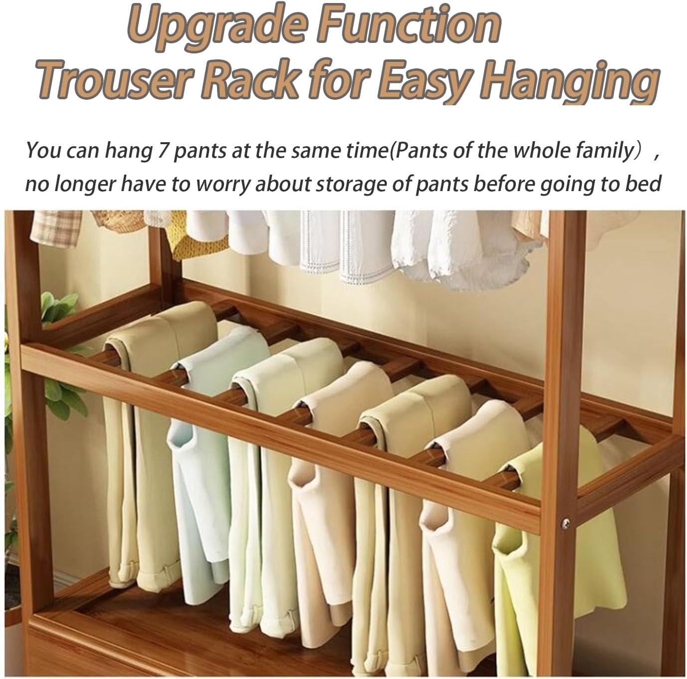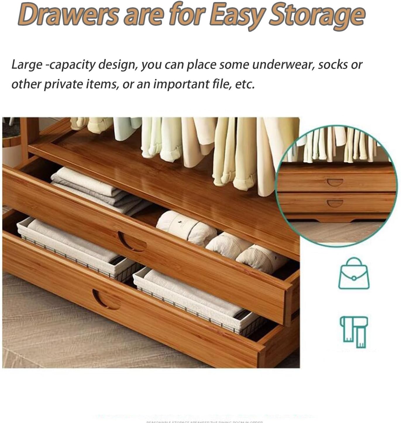 Coat Rack Bamboo Coat Rack Stand Freestanding with Dresses Pants Hang Area, 2 Drawer Private Item and Top Organizer Shelf, Hall Tree for Bedroom Office Entryway Corner