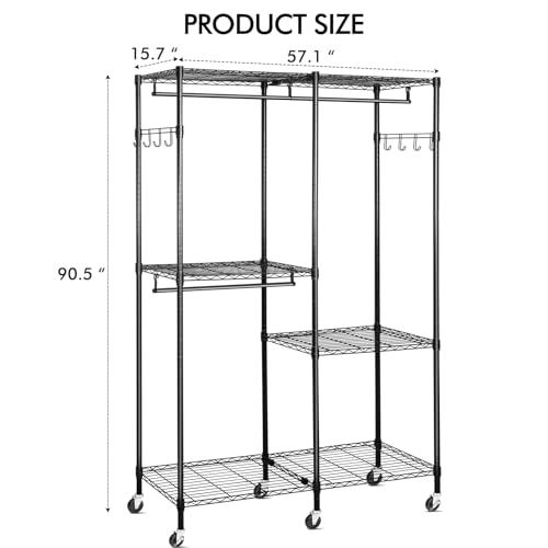 Wire Garment Rack, Heavy Duty Rolling Clothes Rack for Hanging Clothes, Adjustable Metal Clothing Rack with Storage Shelves, Freestanding Closet Wardrobe on Wheels, 57.1" L x 15.7" W x 76.3" H