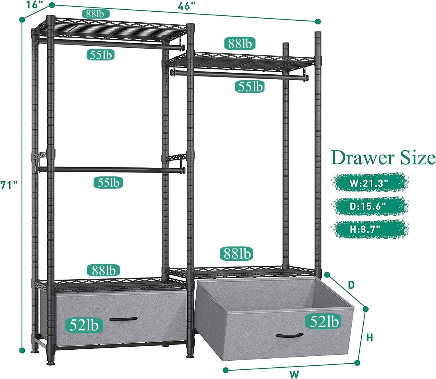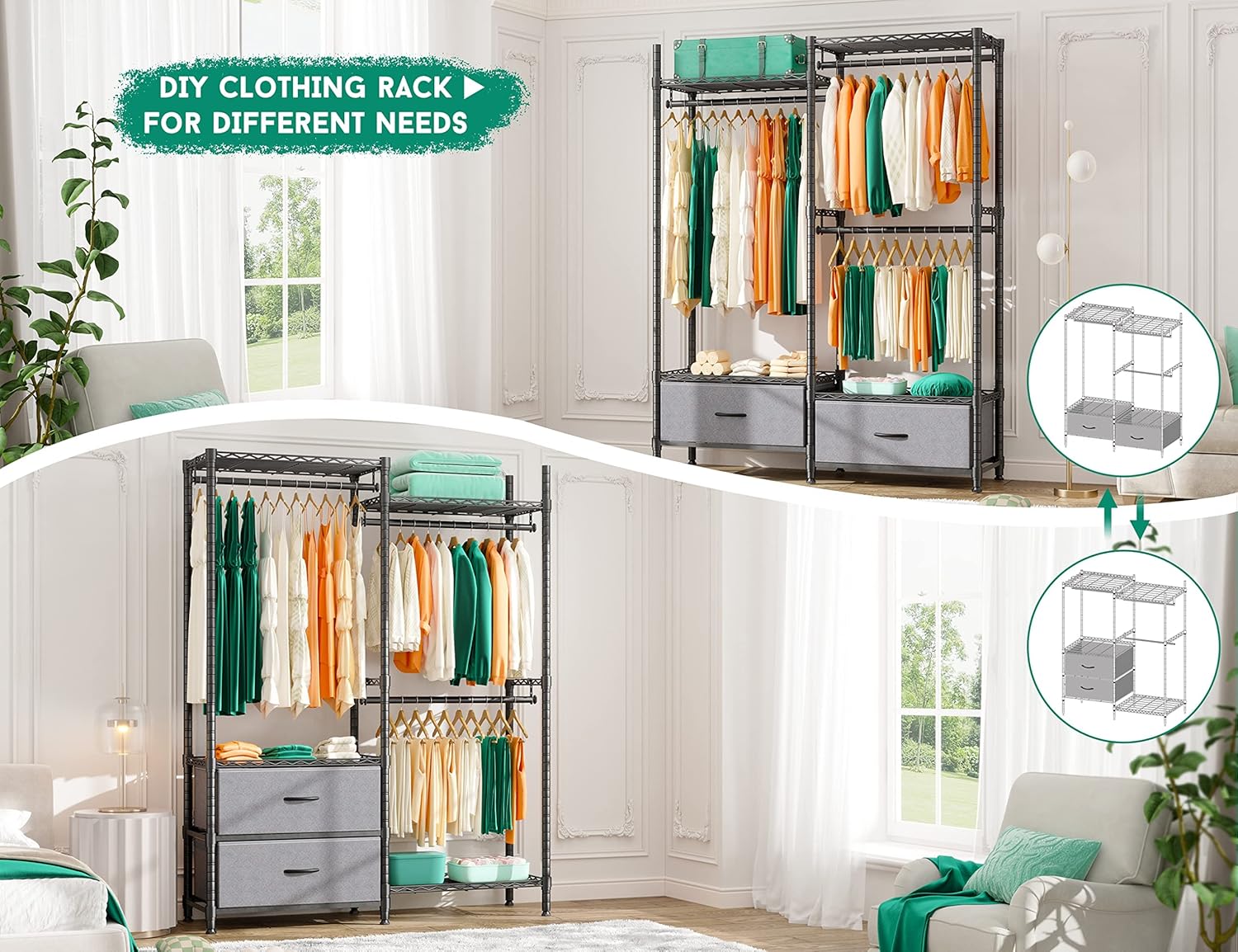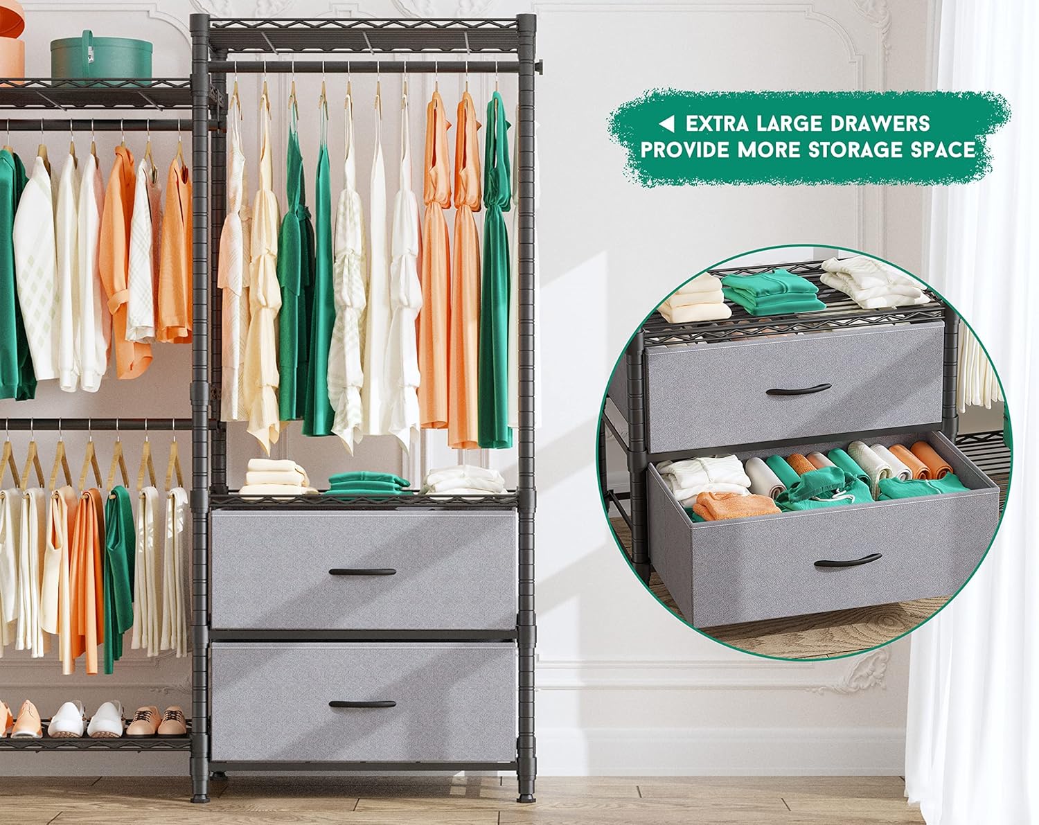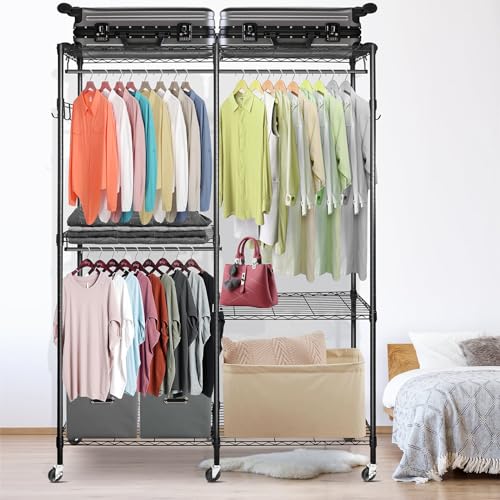 Wire Garment Rack Heavy Duty Clothes Rack,Closet Organizer Metal Garment Rack Portable Clothes Hanger Home Shelf Fabric Drawers,Freestanding Closet Wardrobe,Black