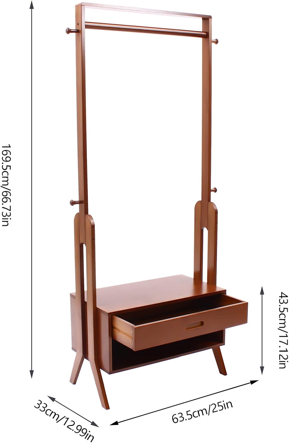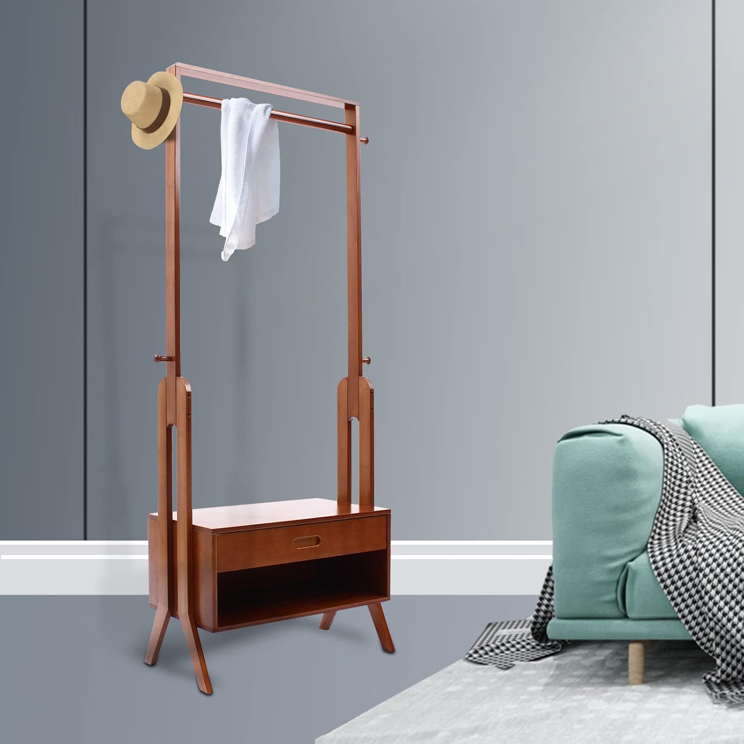 2-In-1 Free-Standing Clothes Rack, 66.73inch Bamboo Garment Rack with Storage Drawer And Hooks Hat Clothing Storage Organizer for Bedroom Hallway Foyer Office Small Apartment