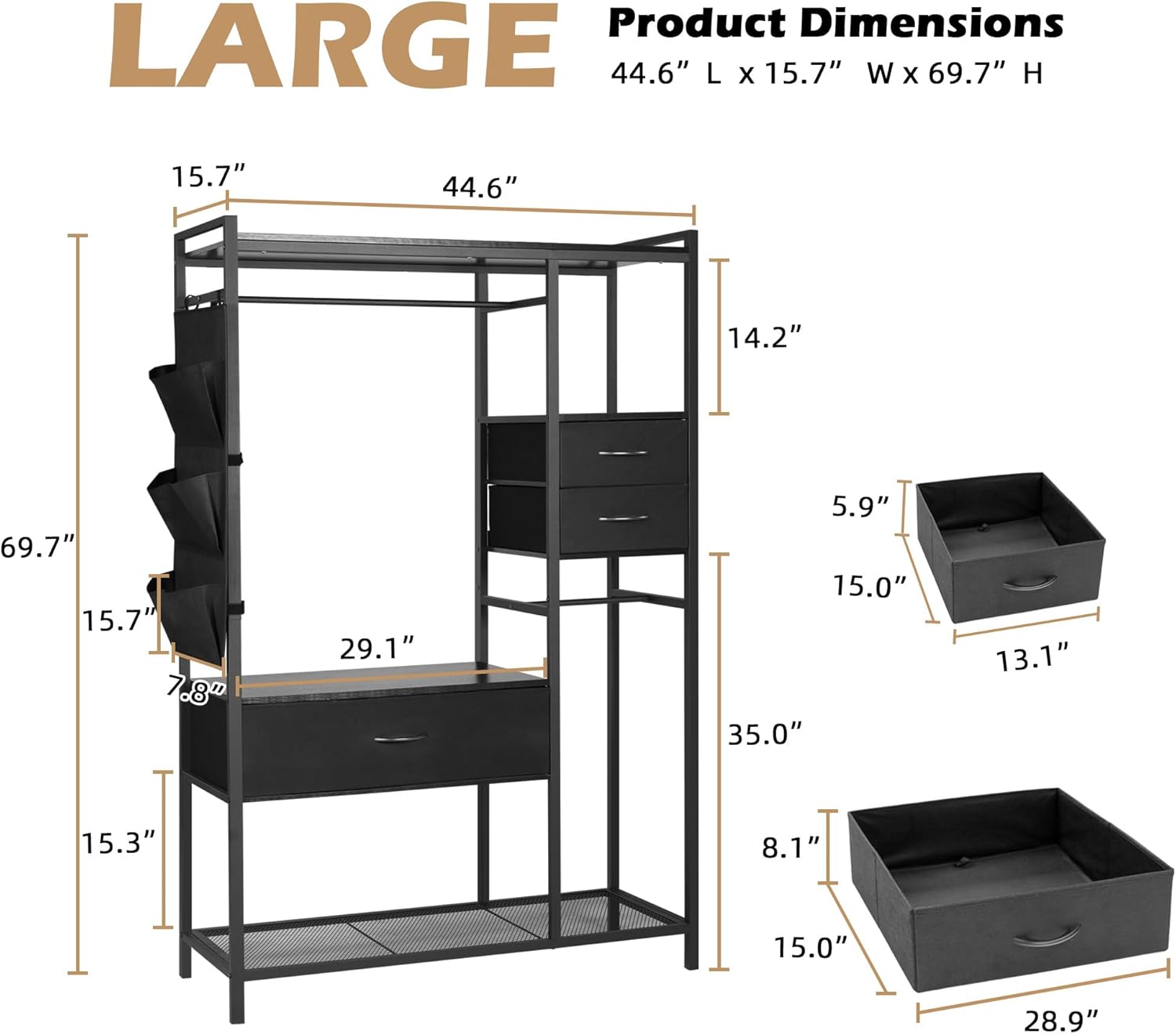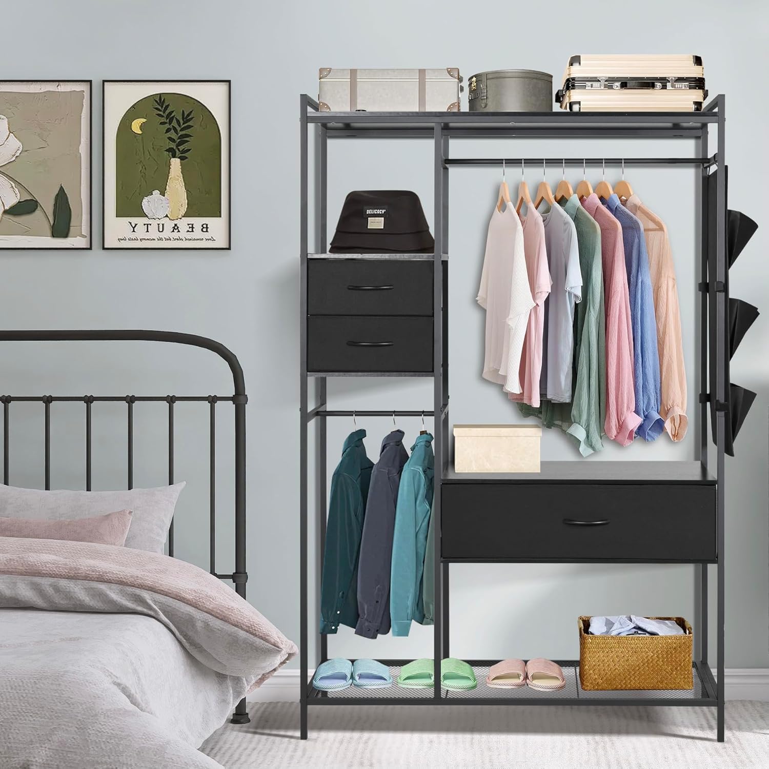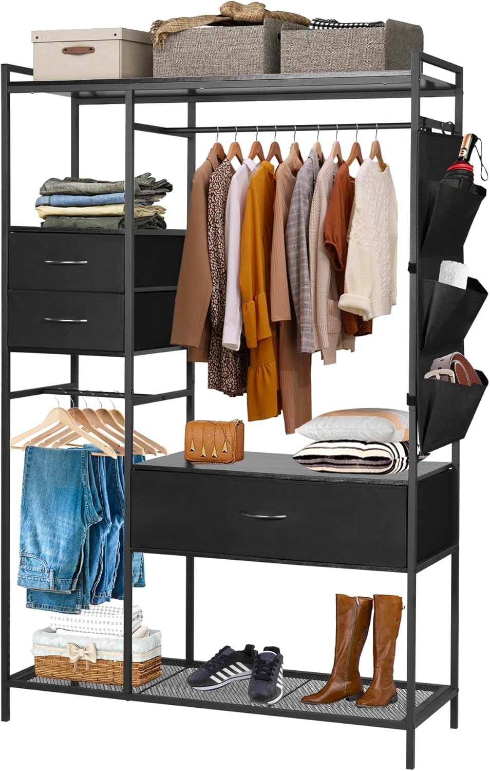 Metal Closet Rack for Hanging Clothes, Freestanding Wardrobe Rack Organizer with 3 Drawers & Sidepocket, Fabric Dresser Organizer System Heavy Duty Armoire Shelf for Bedroom, Living Room,