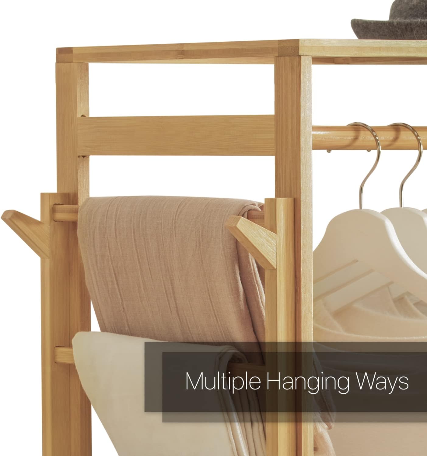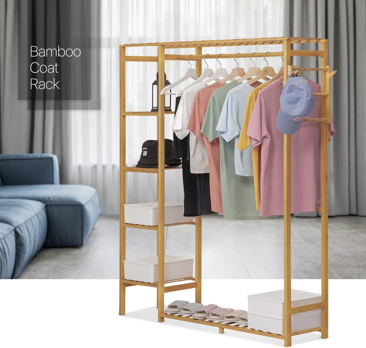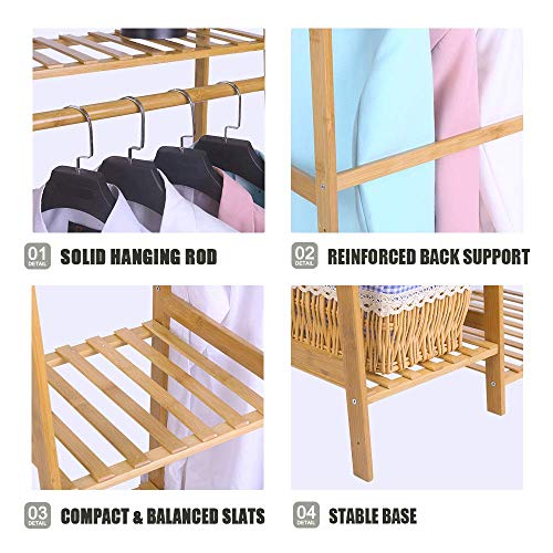 MoNiBloom Bamboo 6-Tier Garment Rack with Shelves Closet Coat Storage Organizer Clothes Hanging Rack with Pants Rack & Hooks for Bedroom, Living Room, Office, Mudroom, Natural