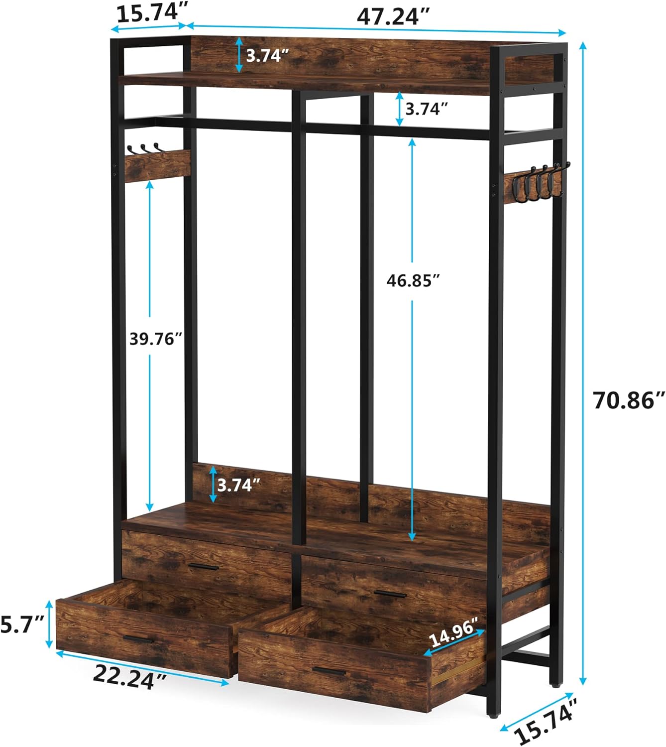 Ufine Bamboo Clothes Hanging Rack with 2 Tier Storage Shelves and 2 Coat Hooks Portable Laundry Rack Cloest Organizer Garment Rack for Bedroom Guest Room