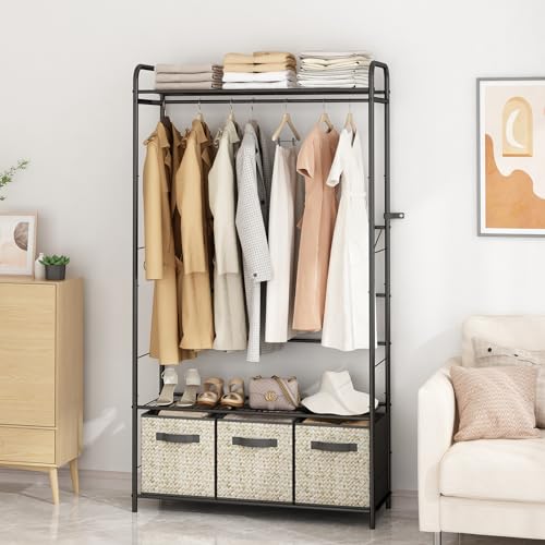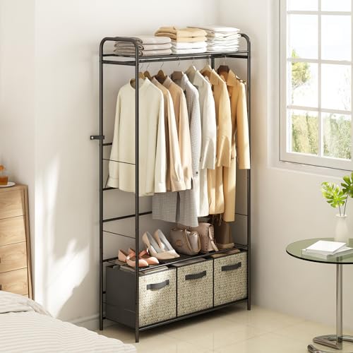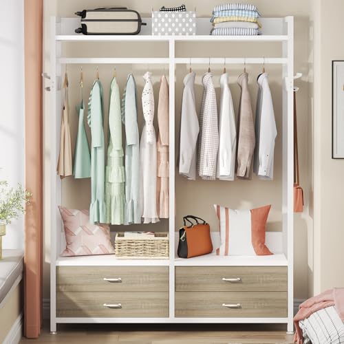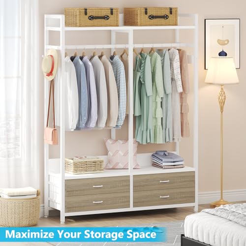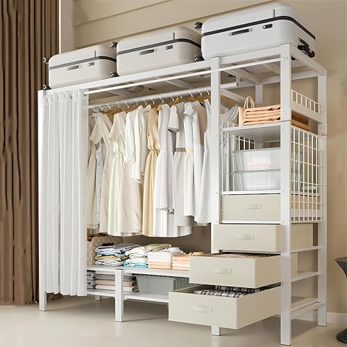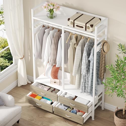 Clothes Rack, Heavy Duty Garment Rack with 4 Drawers, 8 Hooks and Storage Shelves, Wardrobe Closet Storage Rack for Bedroom, Living Room