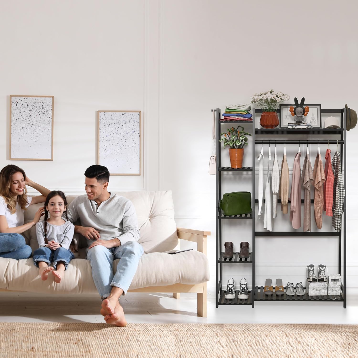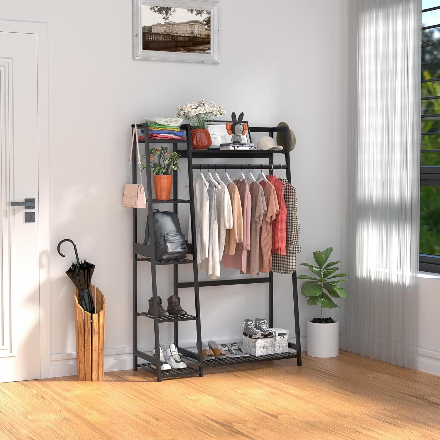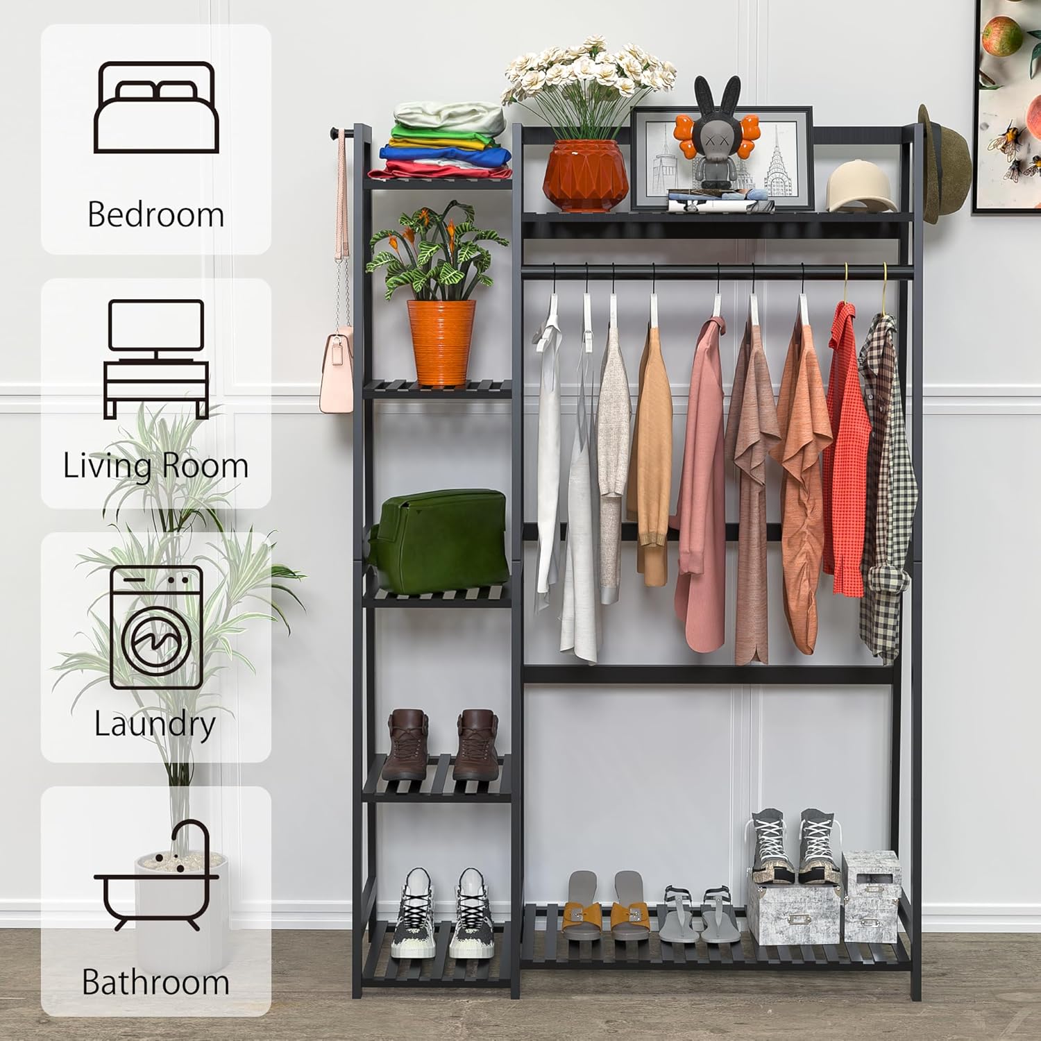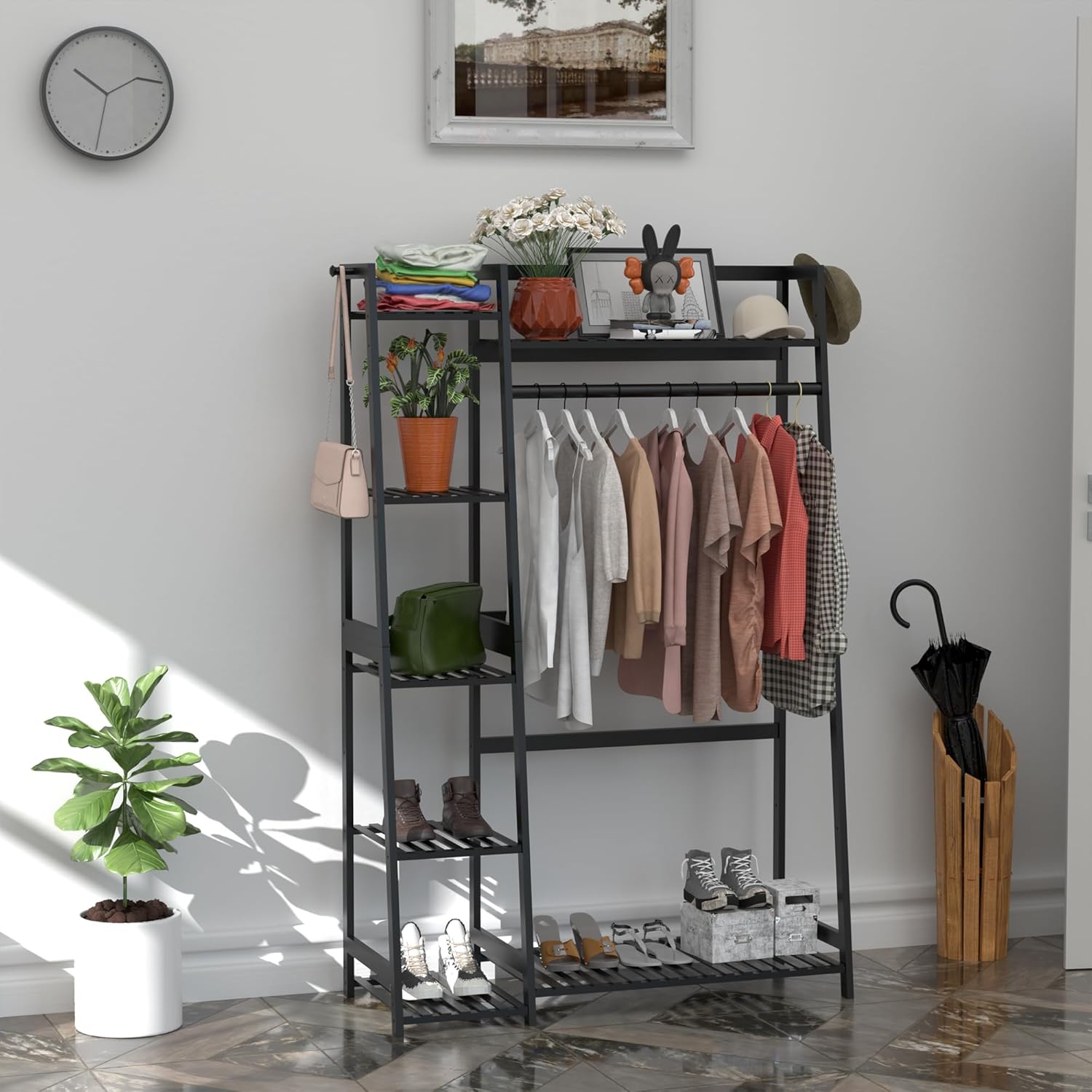 WTZ Clothes Rack for Hanging Clothes, Bamboo Garment Rack Heavy Duty Clothing Rack with Shelves for Living Room, Bedroom, Entryway, Bathroom (CR-538 Black)