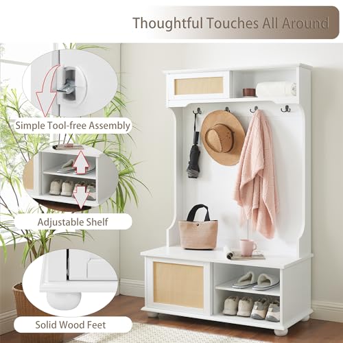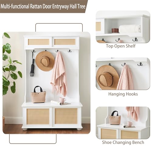 65''Entryway Hall Trees with 4 Hooks, 4-IN-1 Storage Shelves and Shoes Bench, Freestanding Closet Organizer with Coat Rack and Rattan Storage Drawers Shelves for Hallway Bedroom White