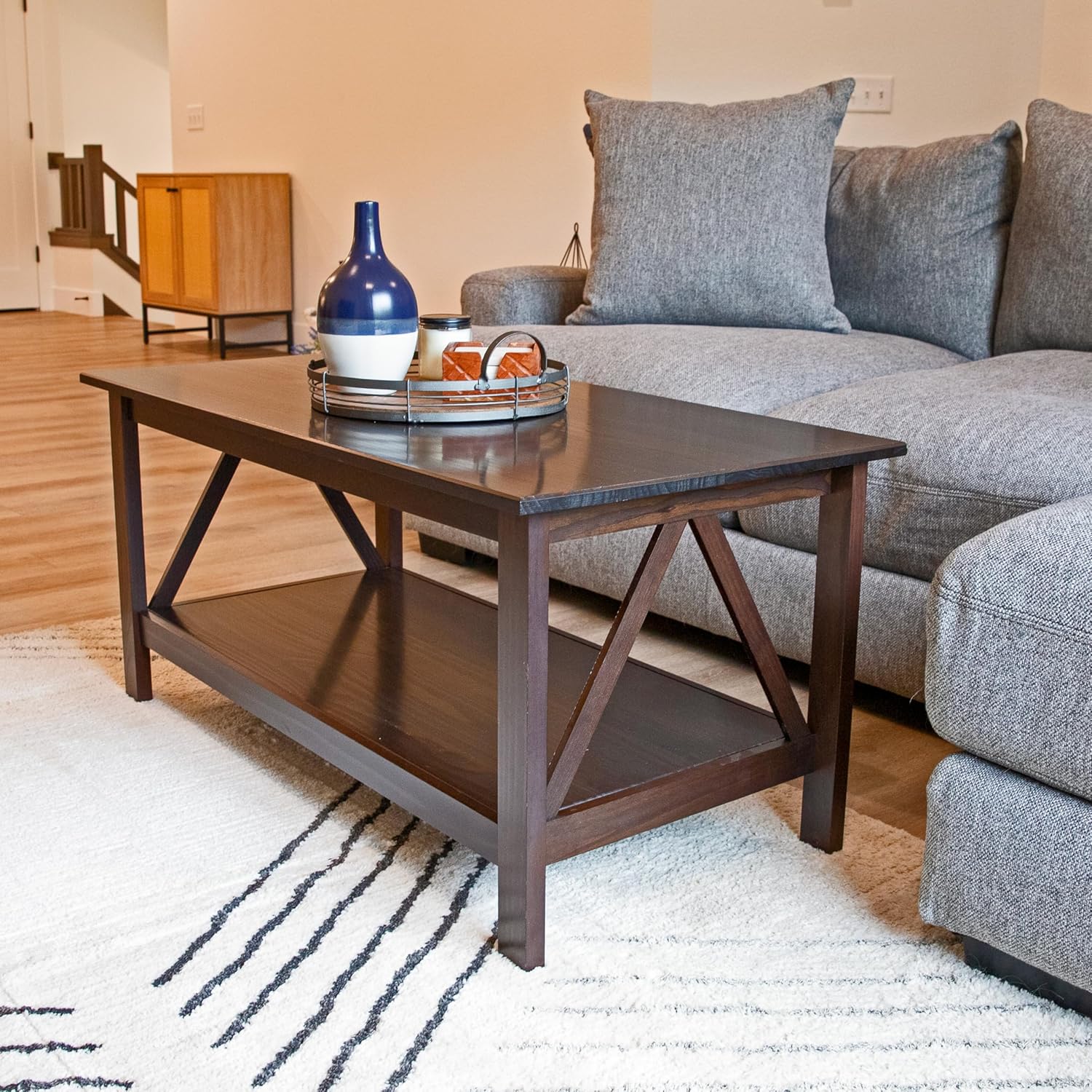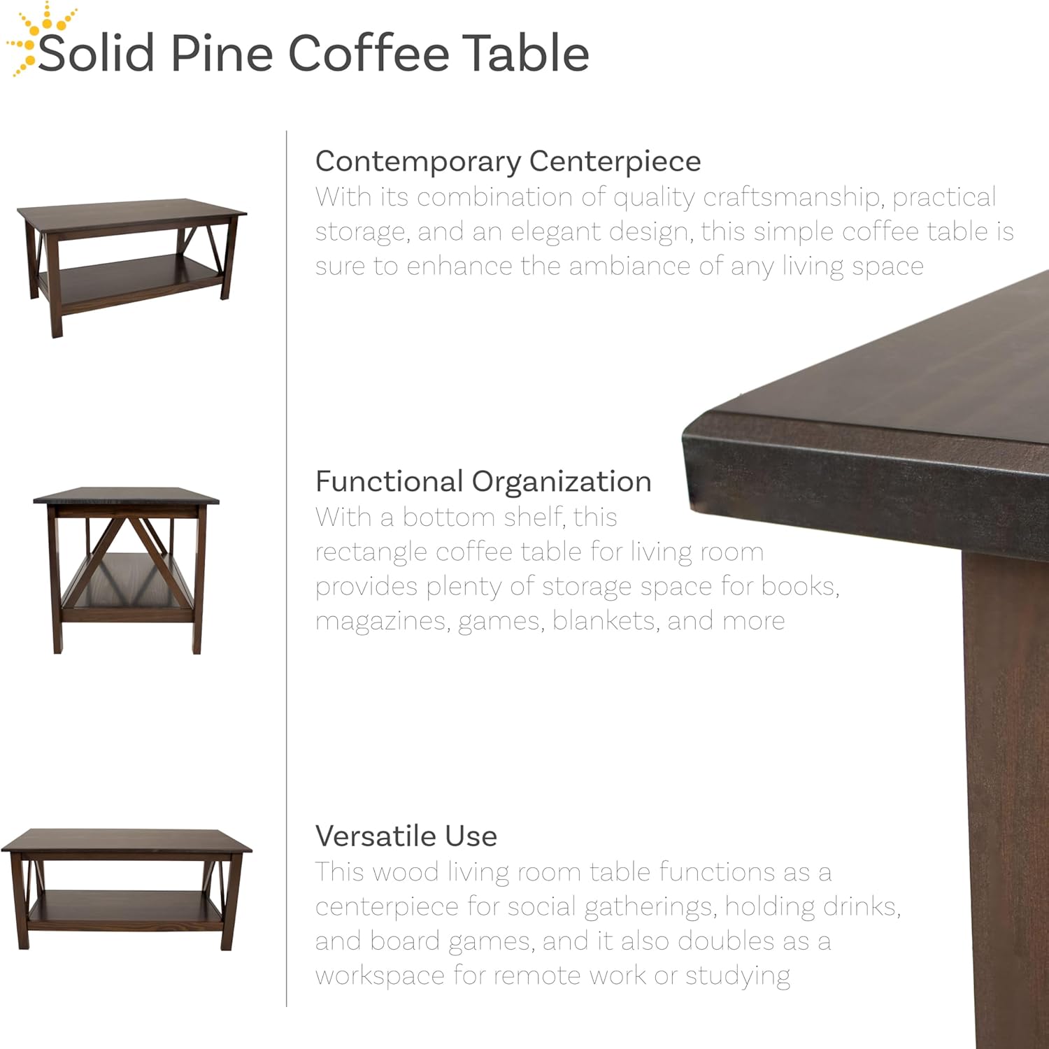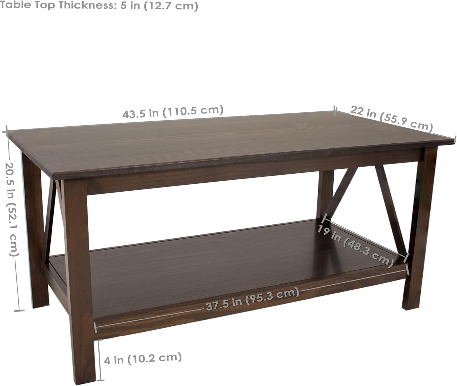 Sunnydaze Dark Wood Coffee Table with Storage Shelf - Indoor Solid Pine Wood Center Table for Living Room - Dark Brown - 43.5" W