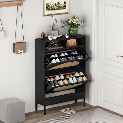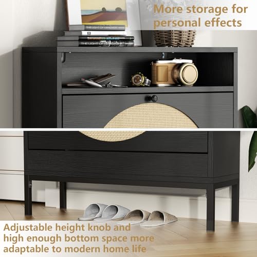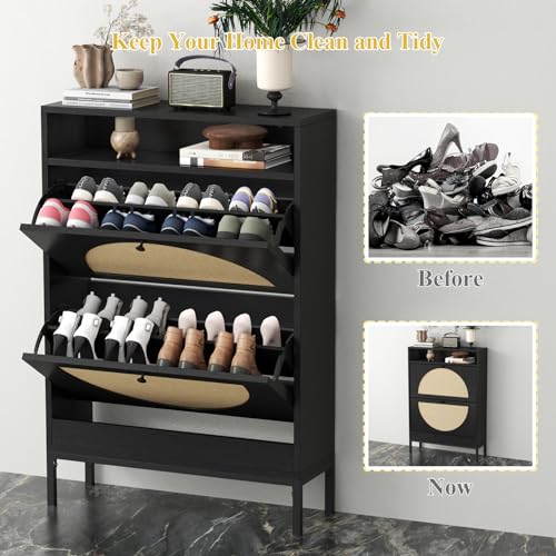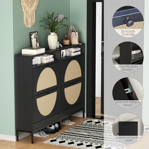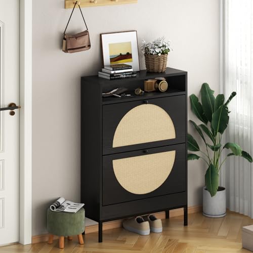 Rattan Shoe Cabinet, Shoe Storage Cabinet with 2 Flip Drawers, Hidden Shoe Storage, Slim Shoe Closet, Sneaker Storage, Shoe Organizer for Entryway, Hallway, Living Room,Black