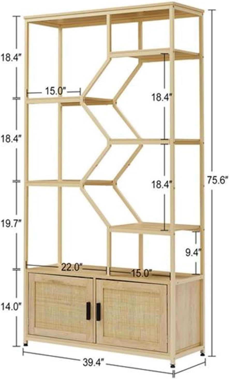 Bohemian Style Furniture Rattan Bookshelf 7-Layer Bookcase Storage Rack with 1 Natural Rattan Storage Cabinet and 6 Open Display Shelves for Living Room Home Office, Natural Color