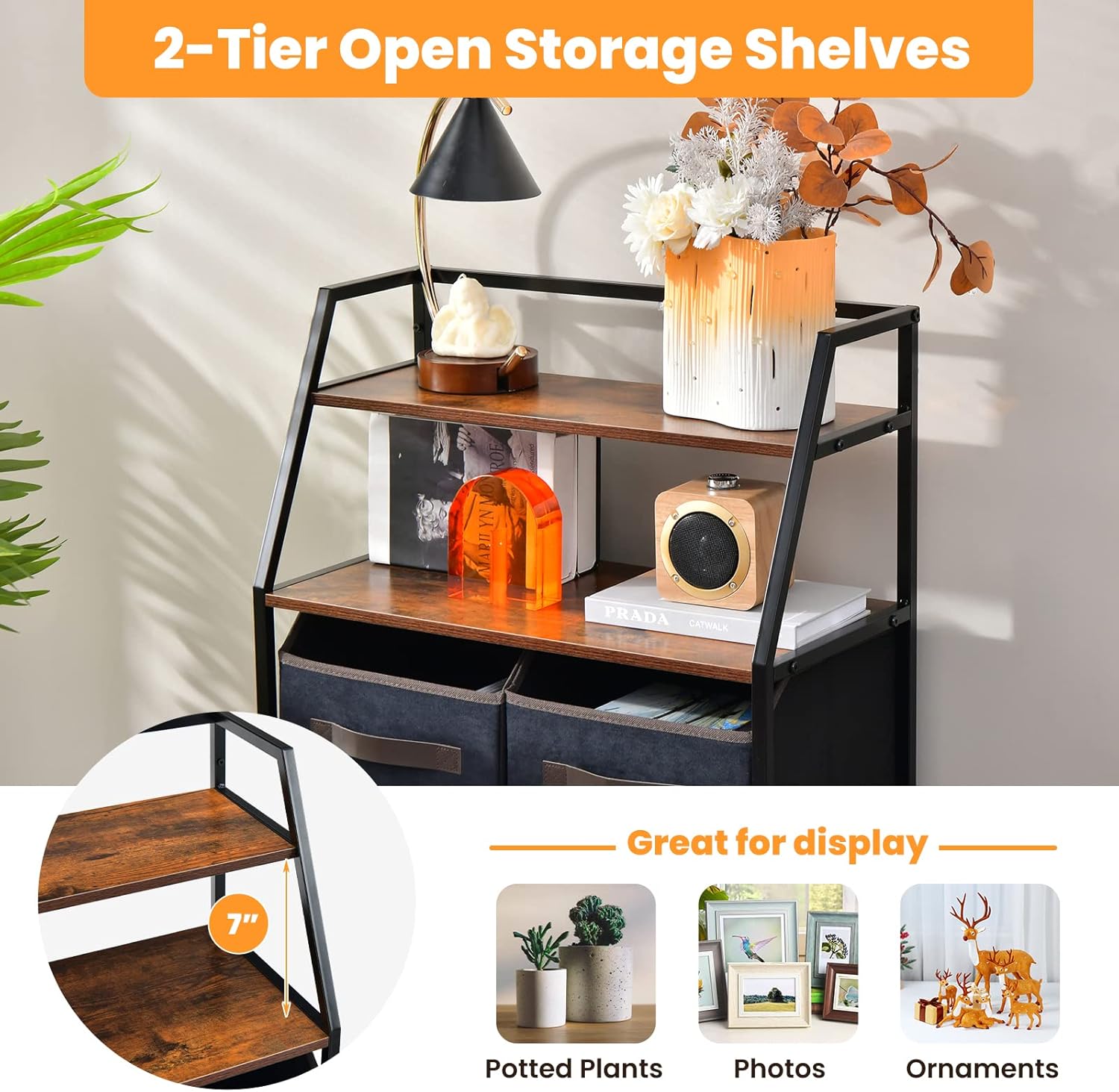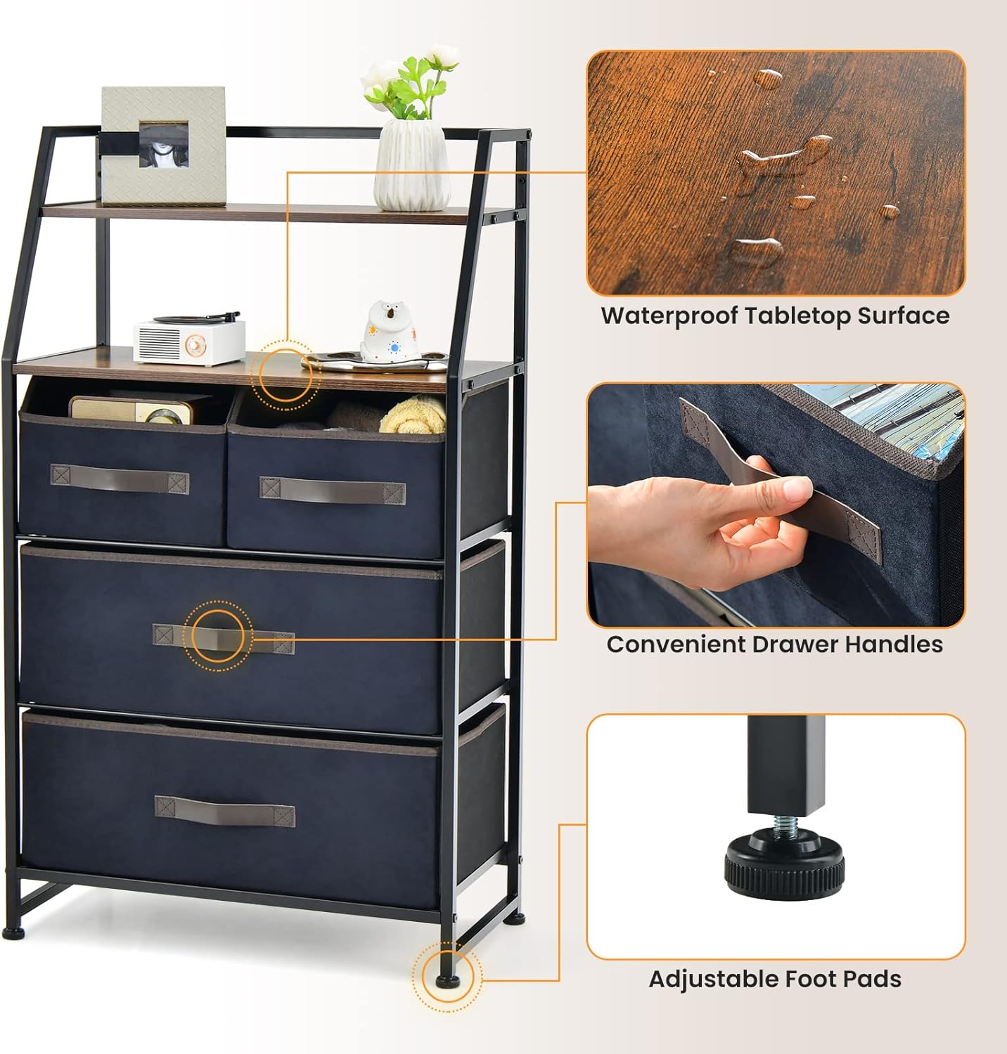 GOFLAME 4 Drawer Dresser with Shelf, Free Standing Fabric Dresser with 2 Open Shelves, Industrial Chest of Drawers, Large Storage Organizer for Closet, Living Room, Entryway, Bedroom