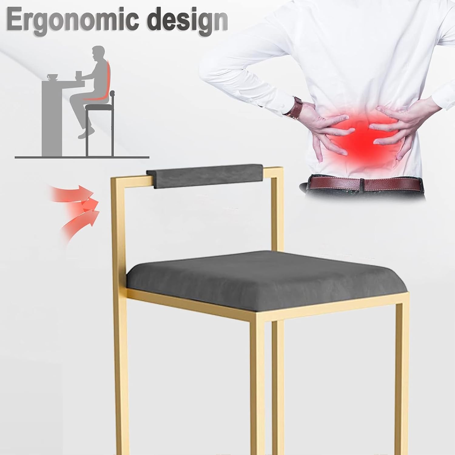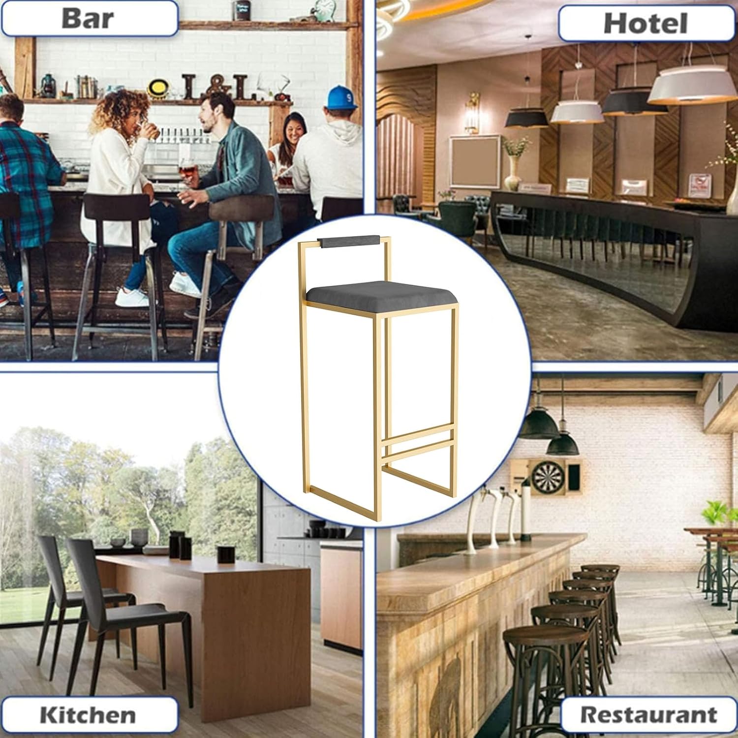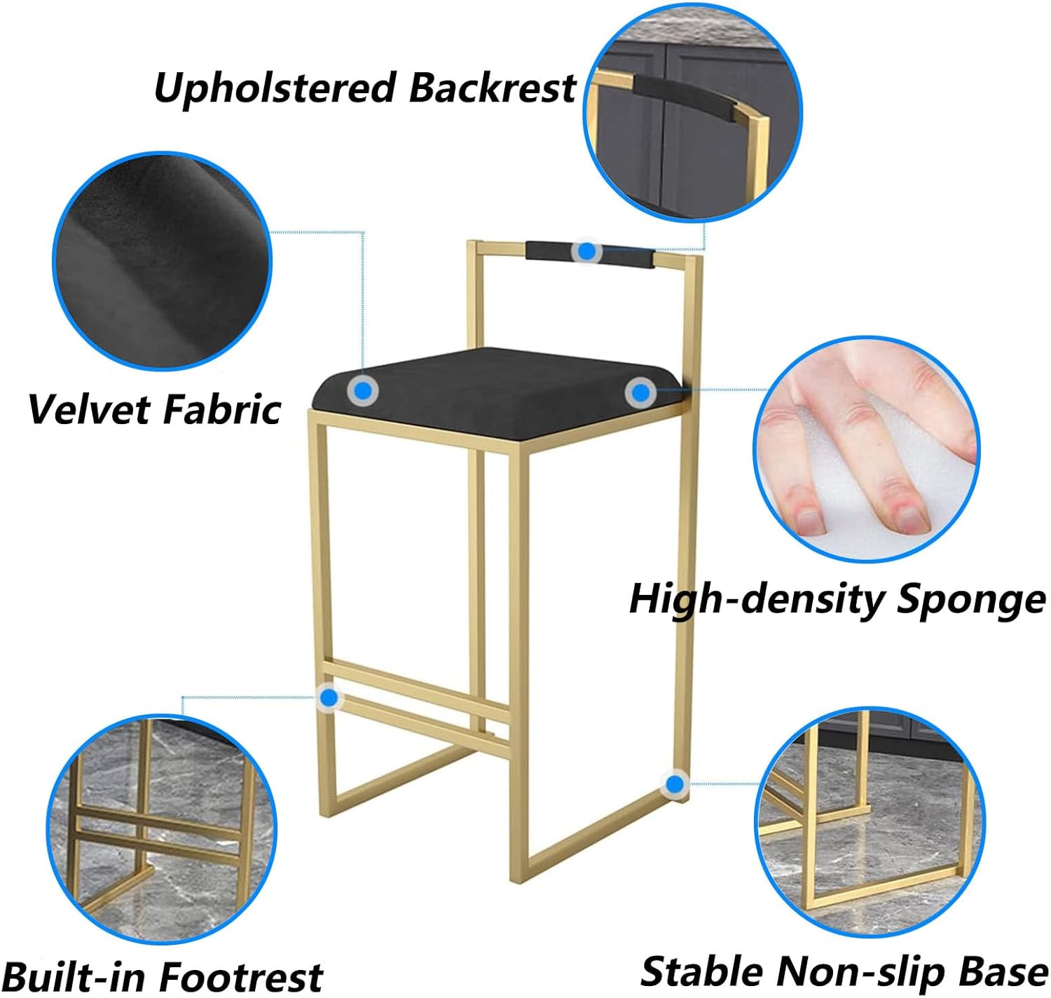 QINGYANG Velvet Bar Stool, Modern Upholstered Tall Stool Bar Chair, Kitchen Island Dining Stools for Home & Commercial Use, Hollow Backrest and Gold Footrest, 2Pcs