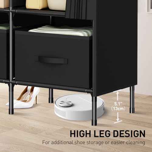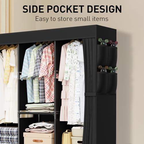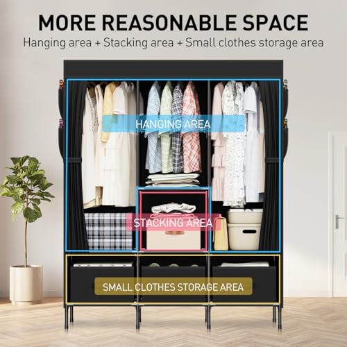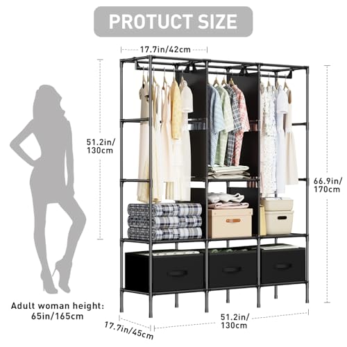 LOEFME Portable Closet, Wardrobe Closet for Hanging Clothes with 3 Drawer Boxes and 8 Side Pockets, 51.2 x 17.7 x 66.9 Inches Clothes Storage Organizer for Bedroom, Living Room, Black