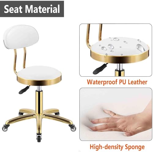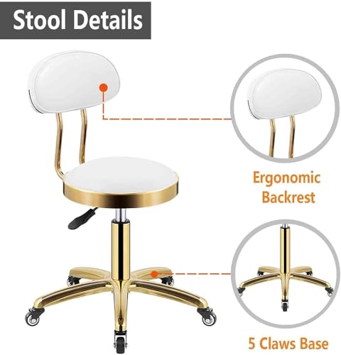 Round Rolling Stool, Swivel Stool with Wheels, PU Leather Swivel Chair, Hydraulic Lift Adjustable Stool for Office Salon Massage Spa, Gold 5 Claw Base with Wheels(Off White)