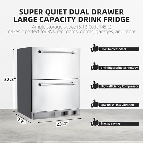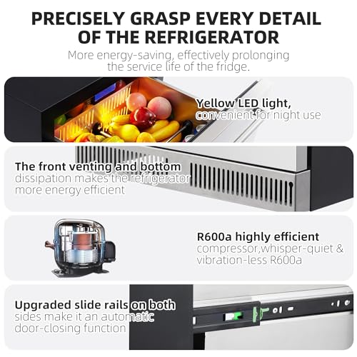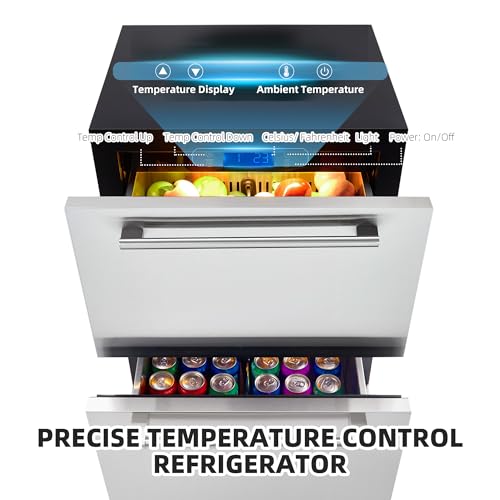 24 Inch Under Counter Drawer Refrigerator, Outdoor Undercounter Fridge for Patio, Built in Wine & Beverage Refrigerator for Home and Commercial, Stainless Steel Door, Fast Cooling, Low Noise, Silver