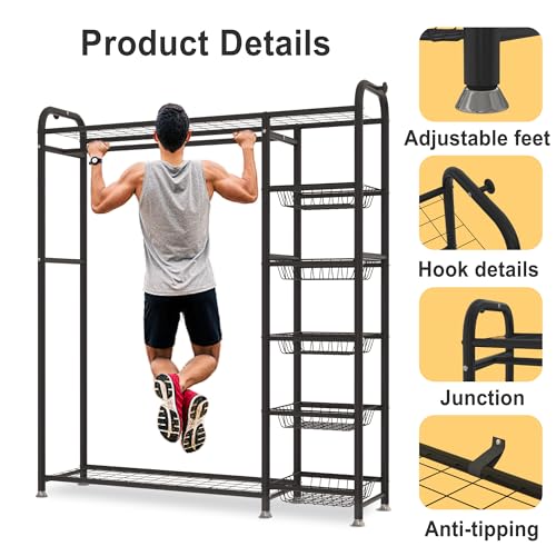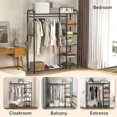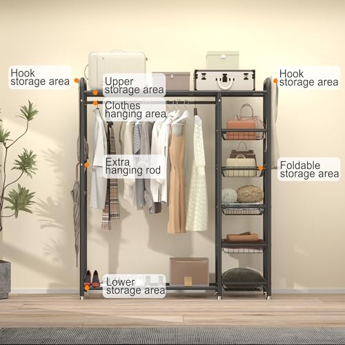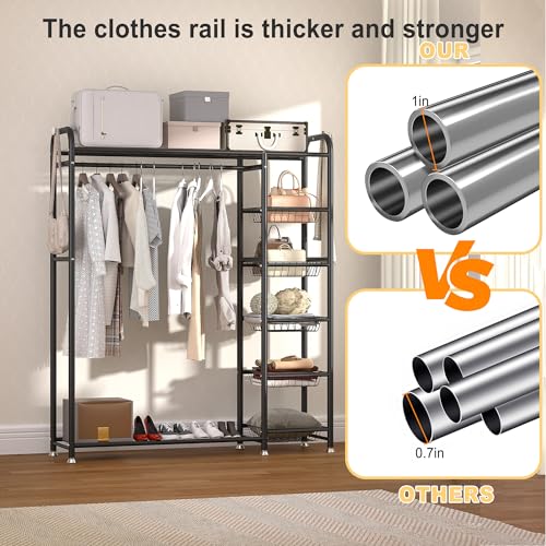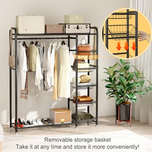 White Metal Garment Rack for Hanging Clothes, Sturdy Versatile Wardrobe Rack with 2 Storage Racks and 5 Baskets, Closet Organizer, Free Standing Clothing Rack for Bedroom, Living Room