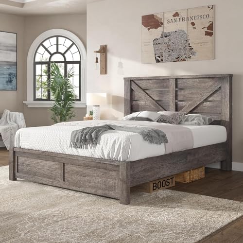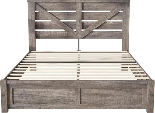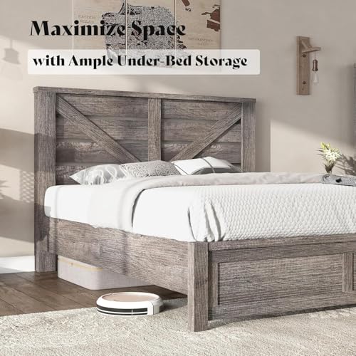 Queen Size Farmhouse Bed Frame with 49.2" Barn Door Headboard, Platform Bed Frame with Slats, Under Bed Storage Space, Easy Assembly, Noisy Free, Rustic Gray(Reclaimed Barnwood,Full)