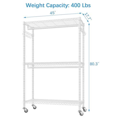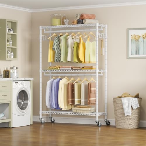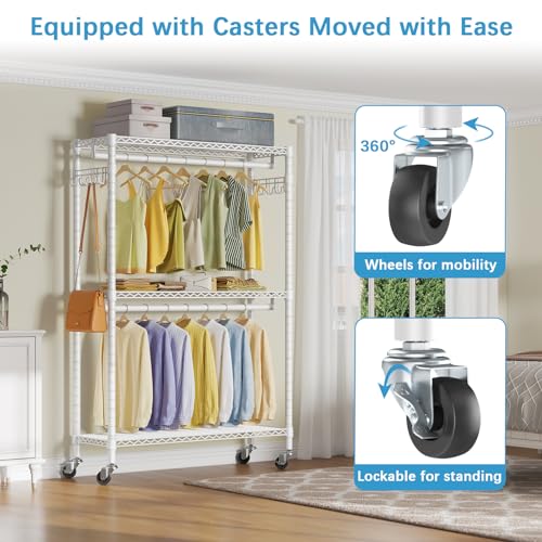 VIPEK V12 Medium Heavy Duty Rolling Garment Rack 3 Tiers Adjustable Clothes Rack with Double Rods & Hooks, Freestanding Wardrobe Closet Storage Rack Metal Clothing Rack for Hanging Clothes, White