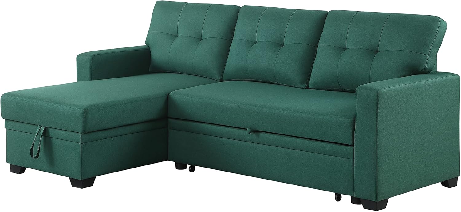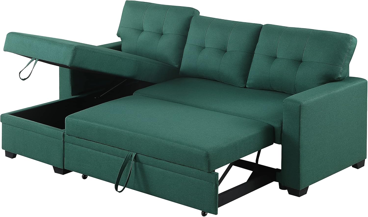Sleeper Sofa, Pull Out Bed, 3 Seat L-Shaped Convertible Sectional Couch with Reversible Storage Chaise for Small Space Apartment, Green