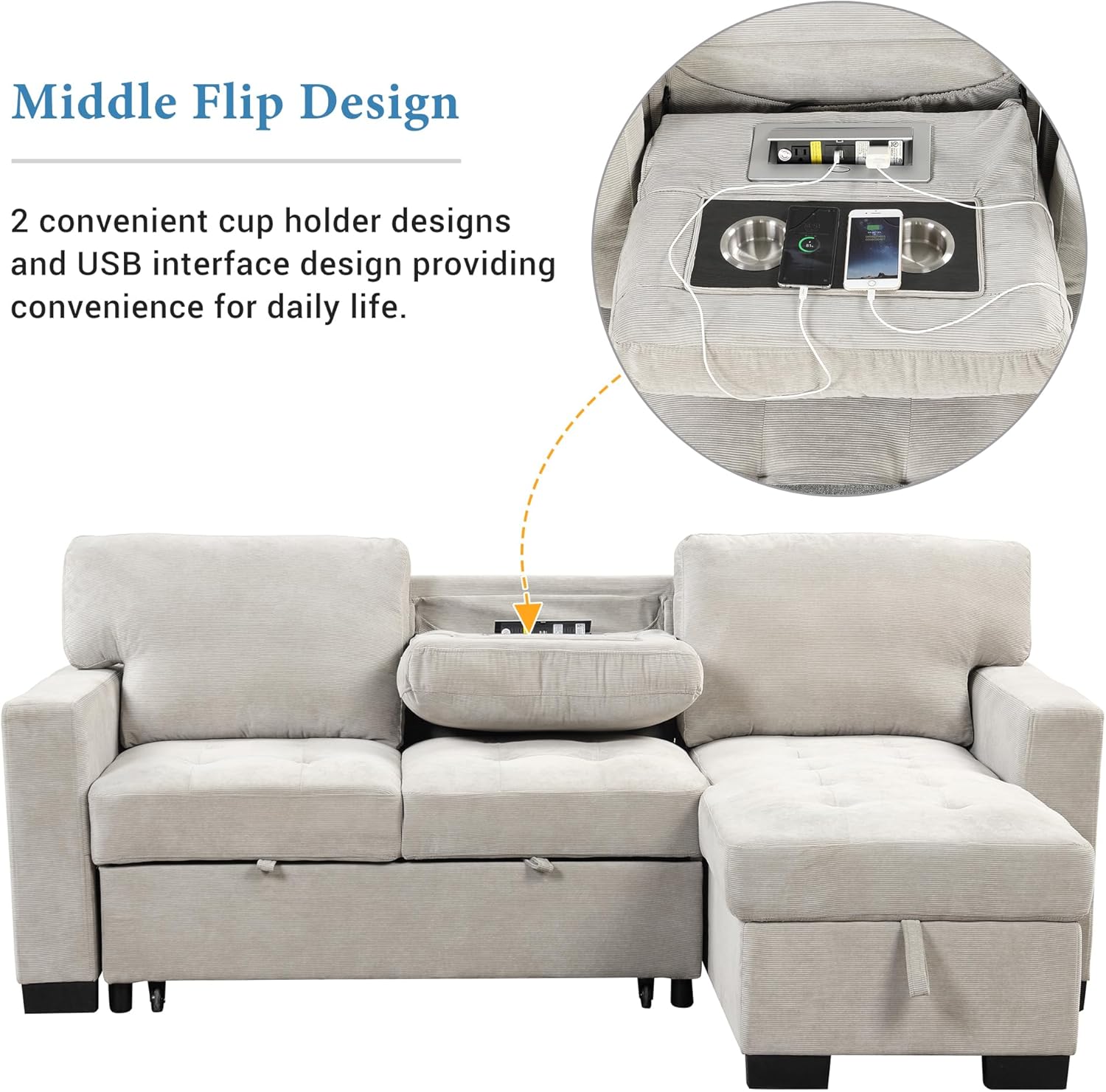 L Shaped Sectional Couch Rack, Cup Holder, Chaise Lounge, Adjustable Armrests, Pull-Out Sofa Bed Drop Down Table and USB Charger, Multiple Storage Options for Small Space, Light Gray