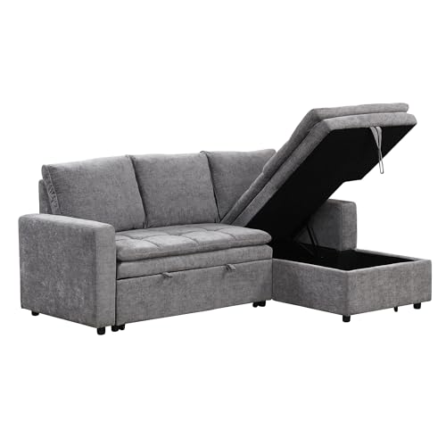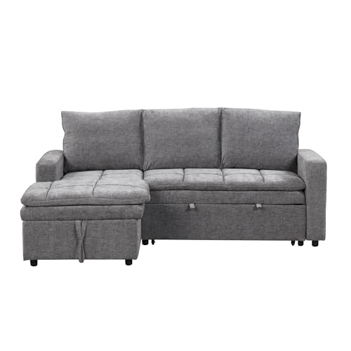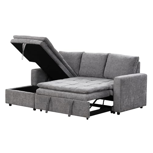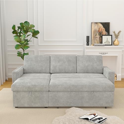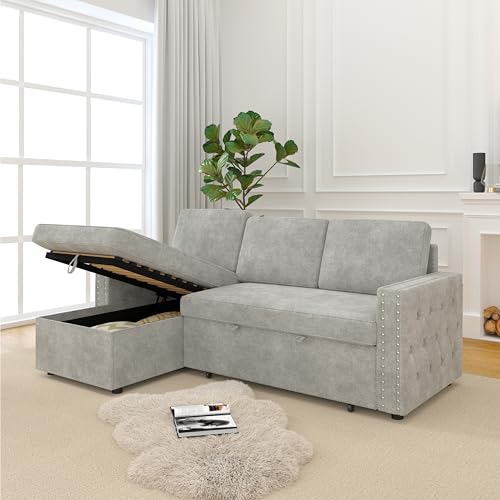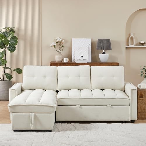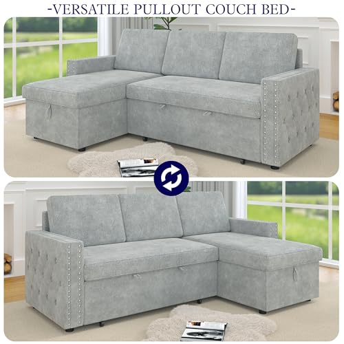 85" L-Shaped Sofa Bed, Reversible Modular Sofa Bed with Pull-Out Bed, Storage Sofa Lounge Chair,Chenille,tylish Square Armrests with Nailhead Design for Living Room,Small Space(Chenille-Beige)