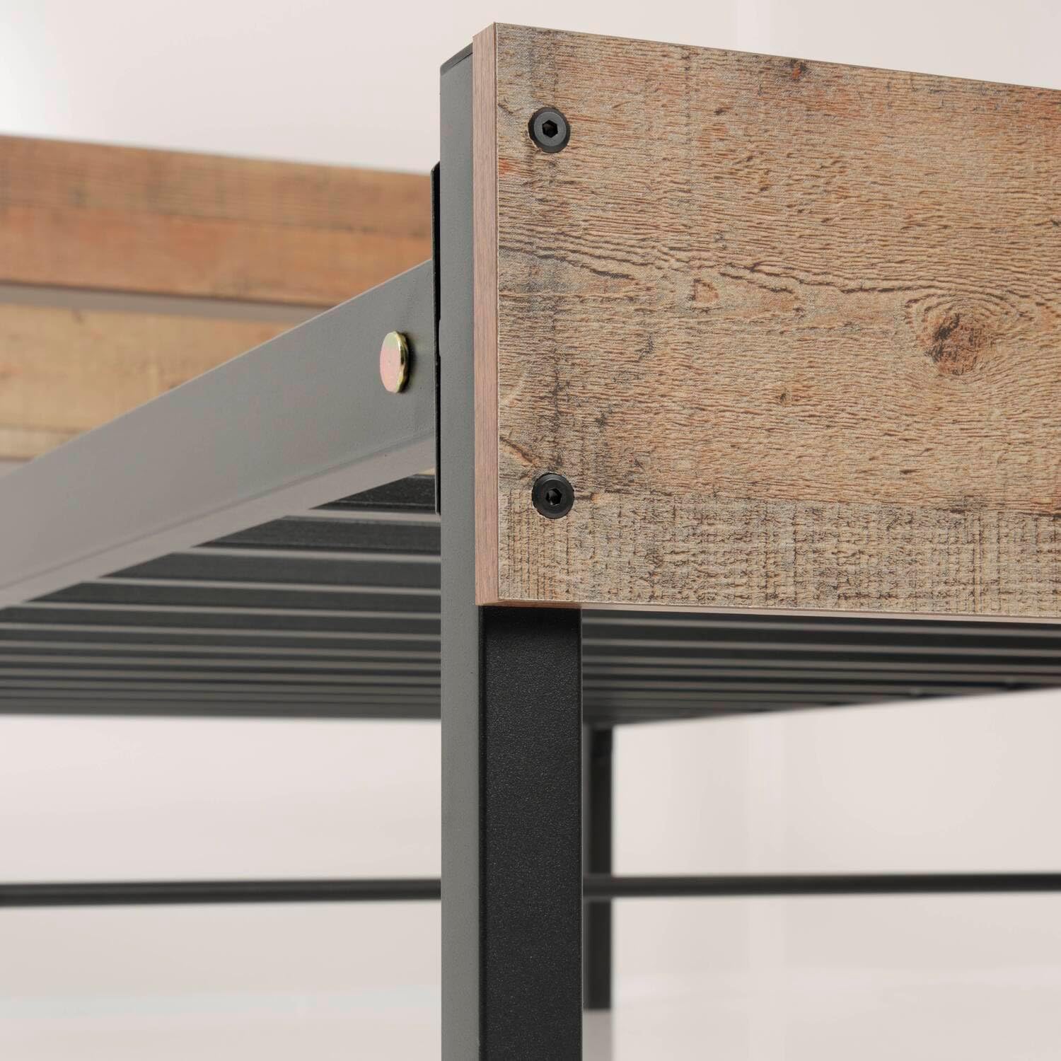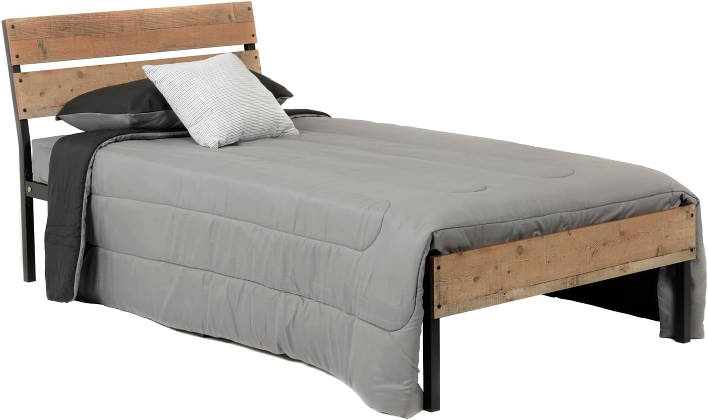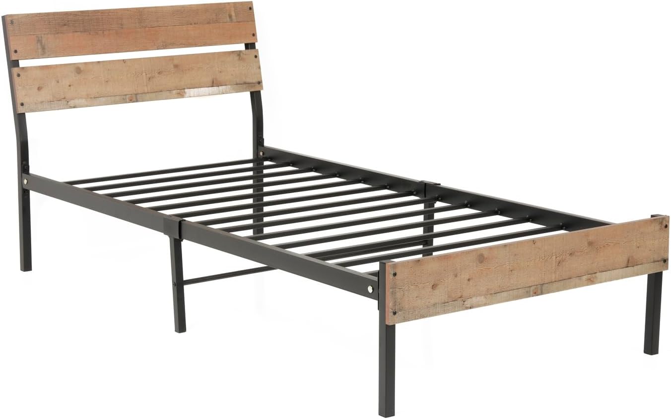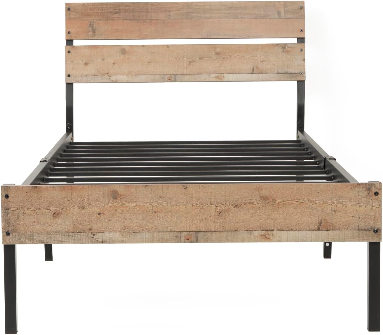 French Country Twin Bed Frame with Sturdy Black Metal Base and Interesting Rustic Reclaimed Barnwood Laminate Headboard and Footboard Panels