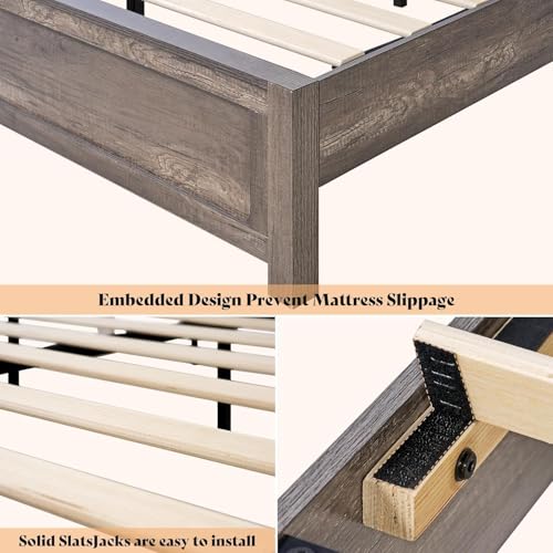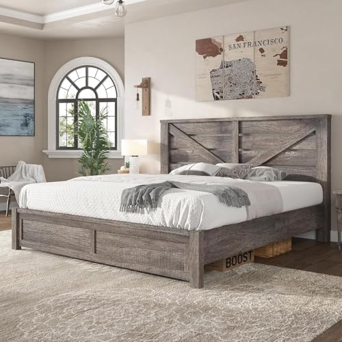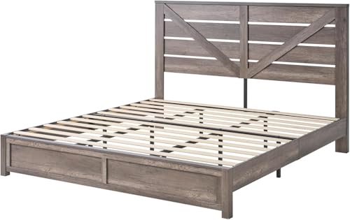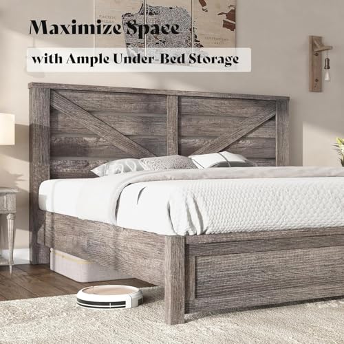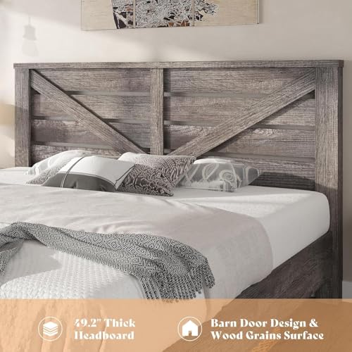 Queen Size Farmhouse Bed Frame with 49.2" Barn Door Headboard, Platform Bed Frame with Slats, Under Bed Storage Space, Easy Assembly, Noisy Free, Rustic Gray Bed Frame