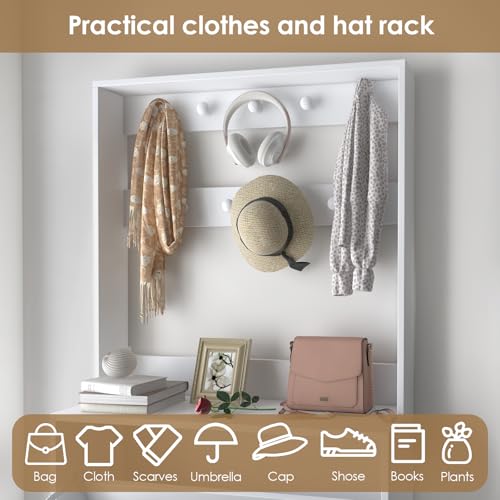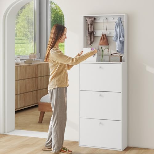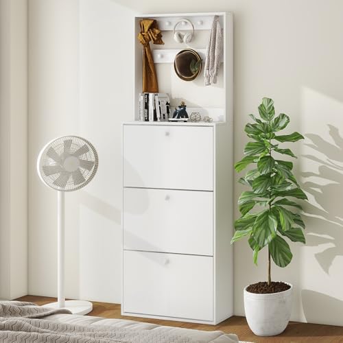 Shoe Storage Cabinet with 3 Flip Drawers, Narrow Shoe Organizer with 9 Hooks Coat Rack, Freestanding Shoe Rack for Entryway,Hallway, Foyer, Bedroom, White