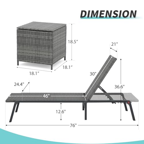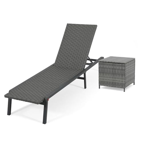 Verano Garden Patio Lounge Chair and Wicker Side Table with Extra Storage 21 Gallon, Outdoor Foldable Aluminum Chaise Lounge and Square Resin Coffee Table for Garden, Yard, Poolside