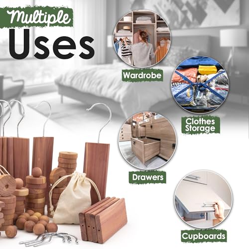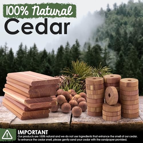 ecoKiwi Cedar Blocks for Clothes Storage Super Bundle Box - Cedar Hangers x10, Balls x30 & Rings x28 - Natural Oil Hanger Planks & Chips for Closets - Sustainable Cedarwood Protection with Sandpaper