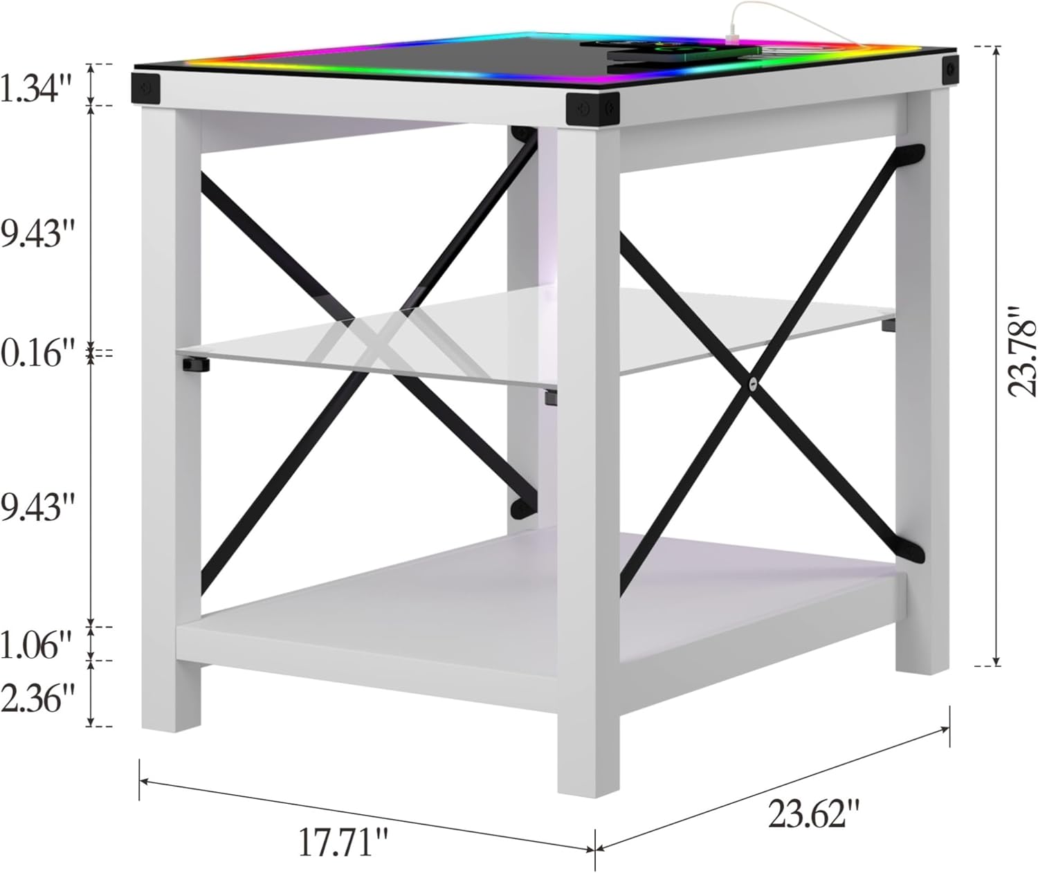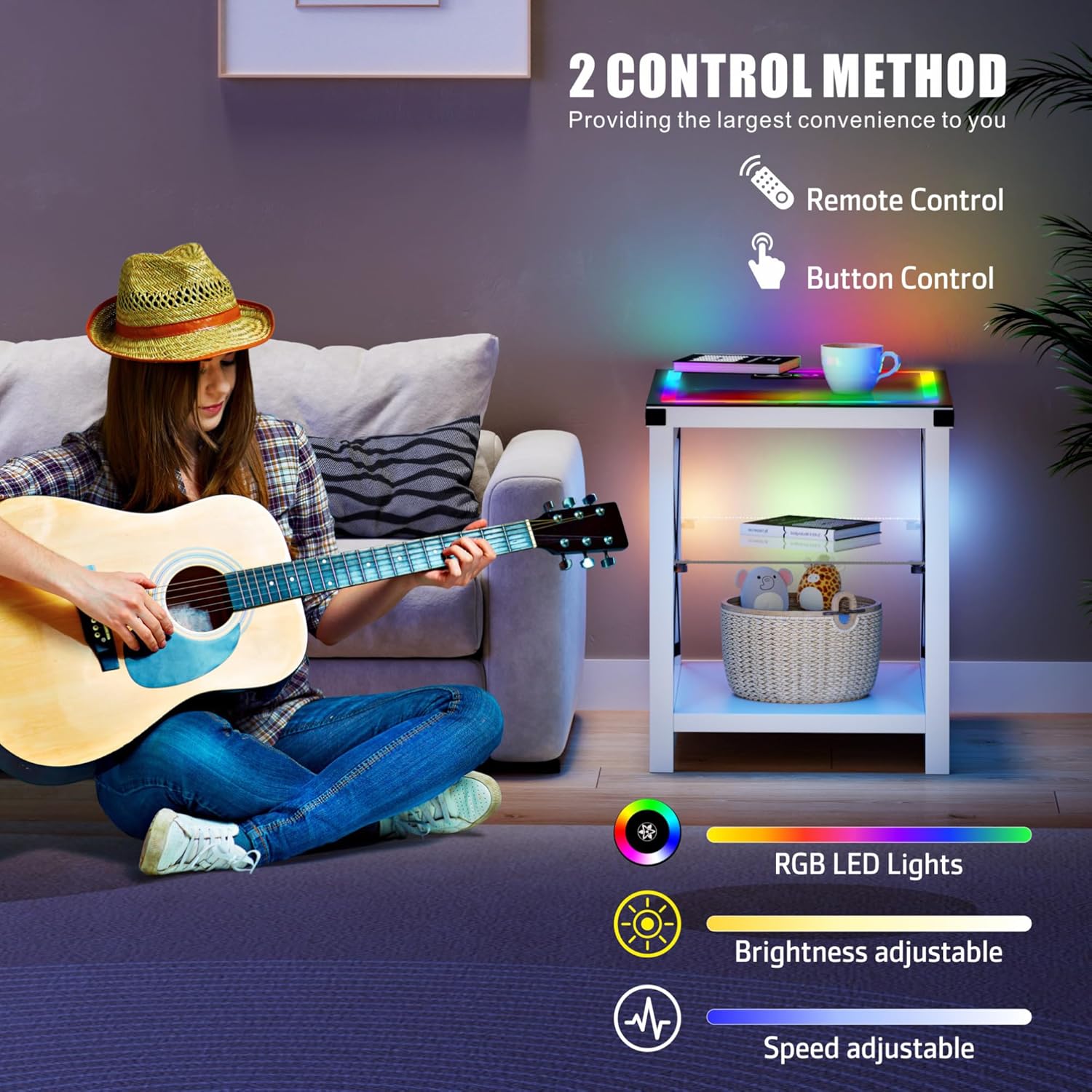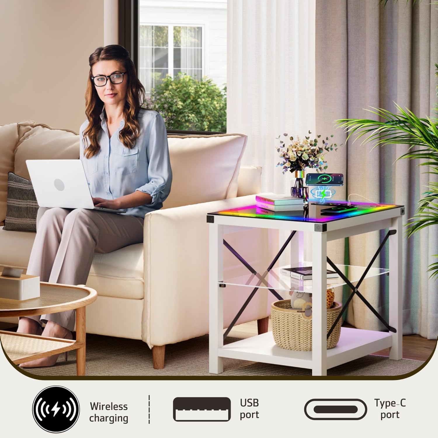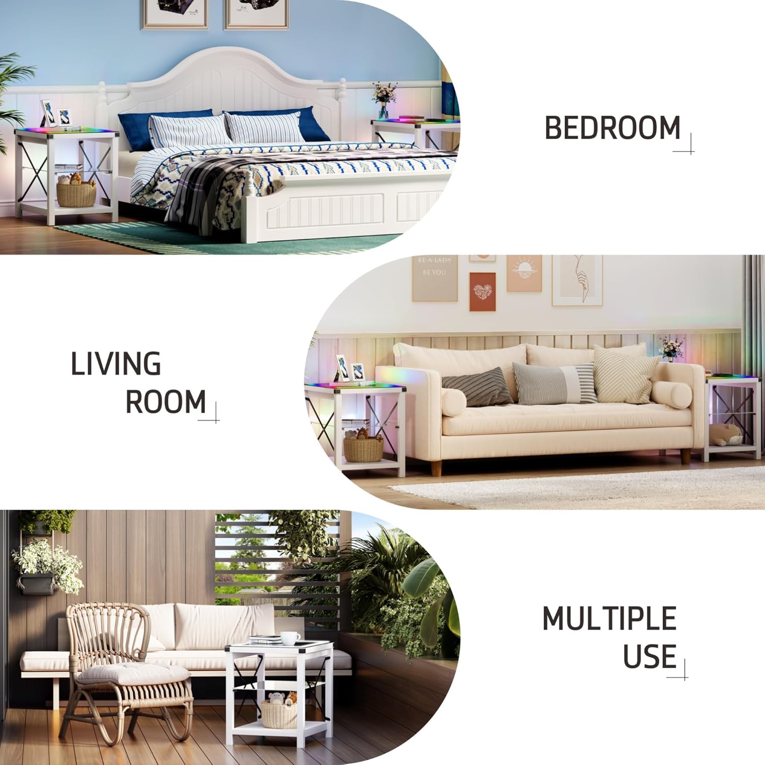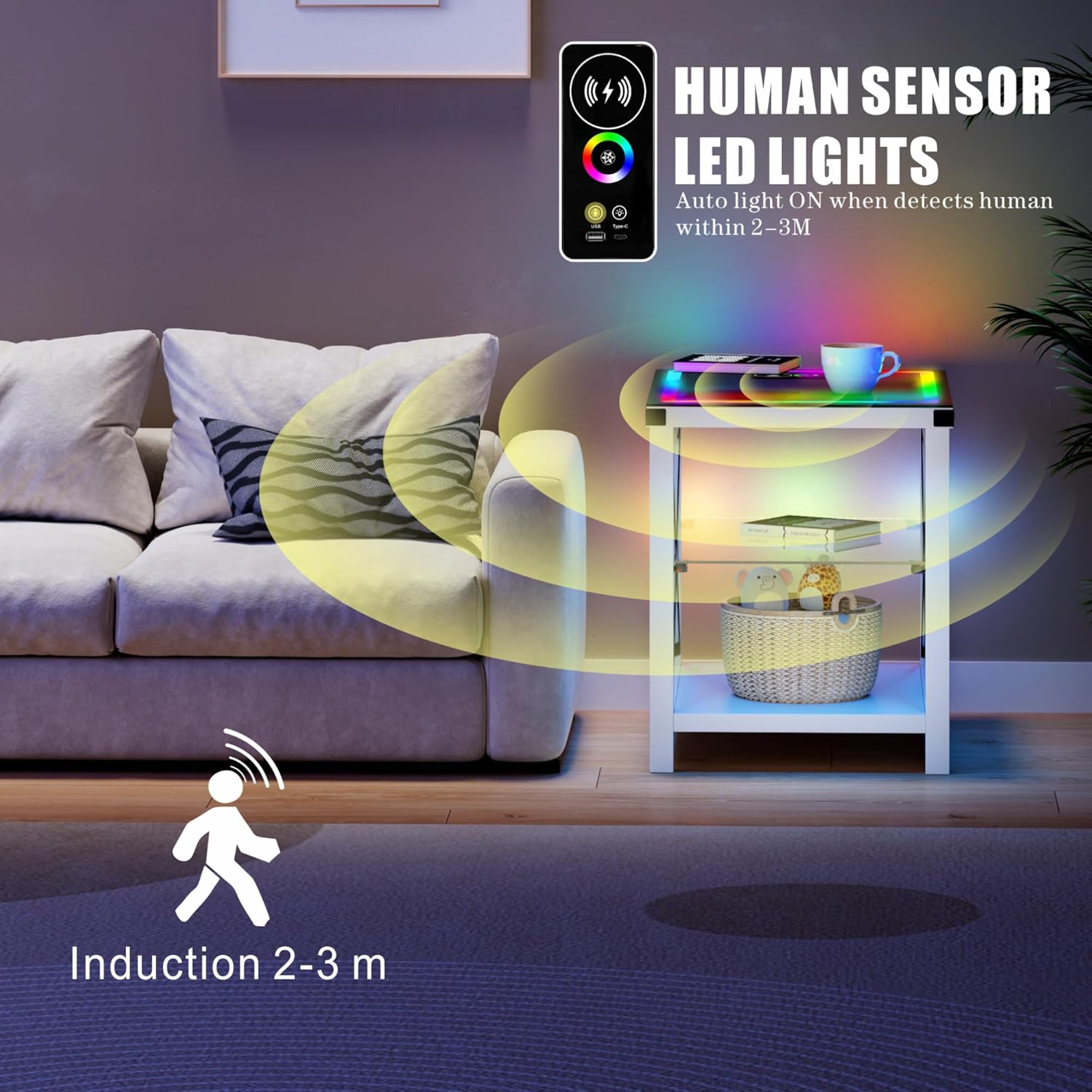 End Side Table set of 2 with Charging Station, LED Night Stand with Human Senor RGB Lights for Small Narrow Place - Smart Nightstand Easy to Assembly for Living Room/Bedroom, White