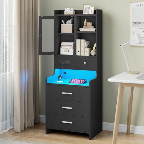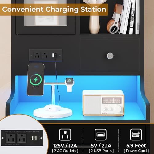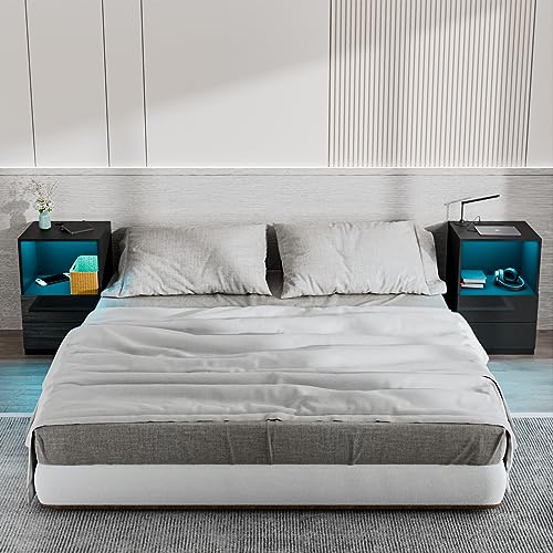 HOMMPA Set of 2 White LED Nightstand with Charging Station End Side Table with Open Shelf Night Stand with Led Lights USB Ports and Outlets Bedside Table with Drawers for Bedroom Furniture