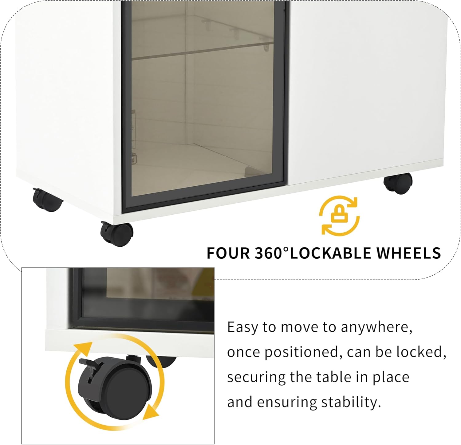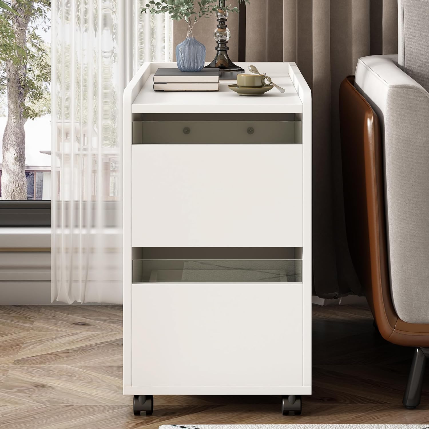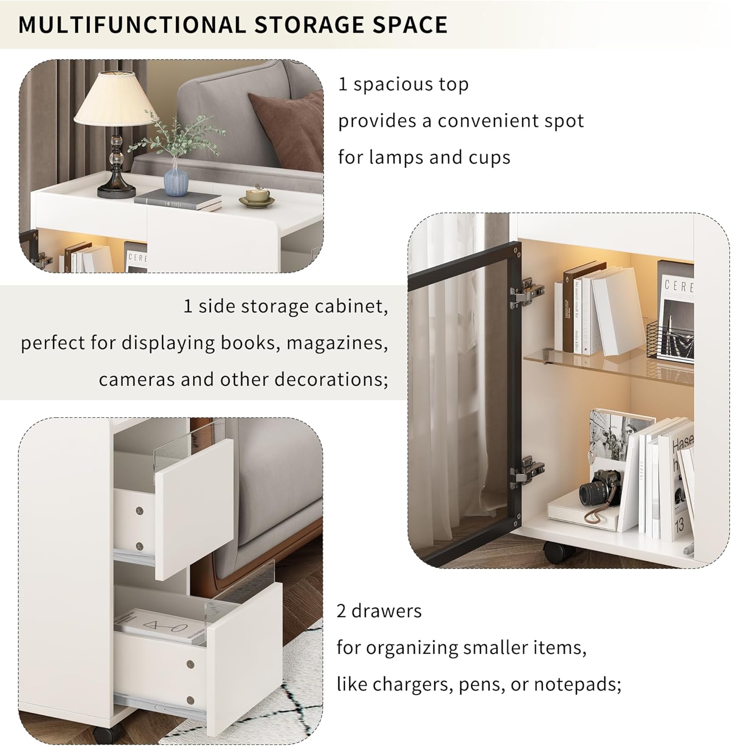 LUMISOL Modern End Table with LED light and Wheels, Side Table with Transparent Brown Glass Door, 2 Storage Shelves and Drawers, Storage Sideboard for Living Room Apartment, White