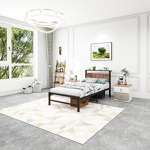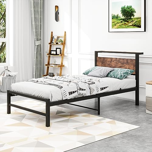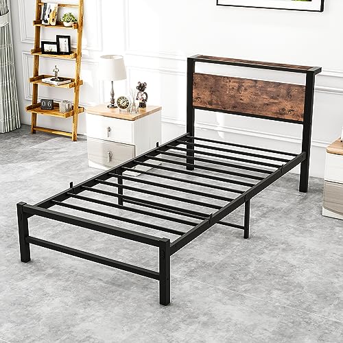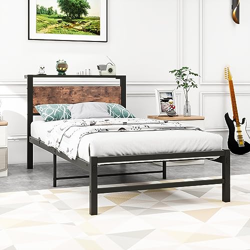 Twin Bed Frame with Wood Storage Headboard No Box Spring Needed,Steel Slats Mattress Foundation Square Pipe Design Noise Free Black