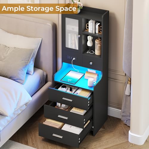 White Nightstand Set of 2, LED Night Stand Set 2 with Charging Station, Tall Bedside Table with Drawers & Shelves, End Side Table with Lights & Storage